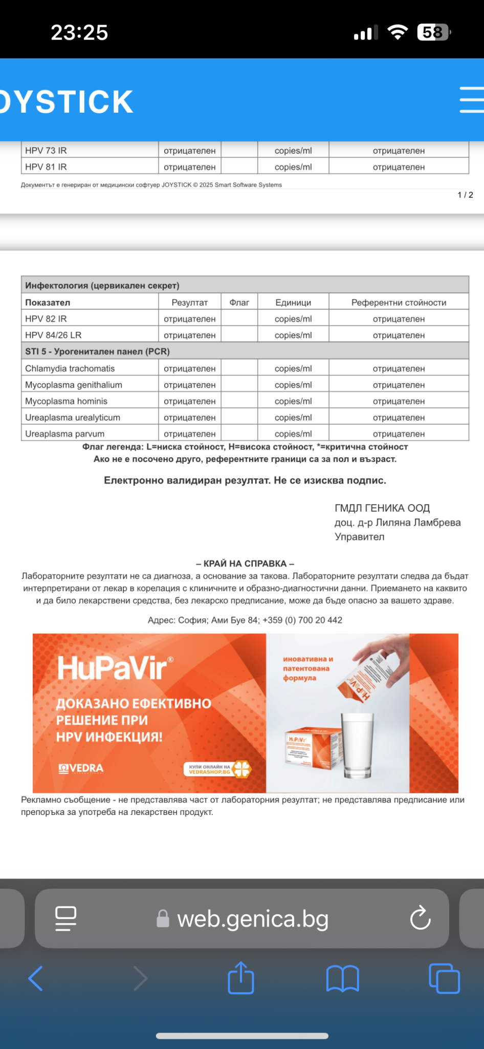 Последни новини - гинеколожката ми каза, че щом резултатите от Геника са отрицателни това значи, че в някакъв момент организмът ми е преборил вируса, нямало нужда от допълнителни прегледи и изследвания сега, чак след 6 месеца. Не я попитах за Хупавира, защото според мен не може да ми даде адекватно мнение при положение, че приятелят ми изобщо не е тестван (лечението е и за двамата). Във вторник сме на дерматолог и двамата и все пак искам мнение има ли някоя, която е взимала имуностимуланти при отрицателен тест, но при наличие на кондиломи?
