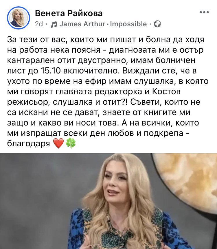 Явно търсят начин да я разкарат без да плащат огромните неустойки и се опитват да ѝ замажат очите с някоя рубрика. Тя не е съгласна и затова е в болничен. Просто се опитват да се надцакат.