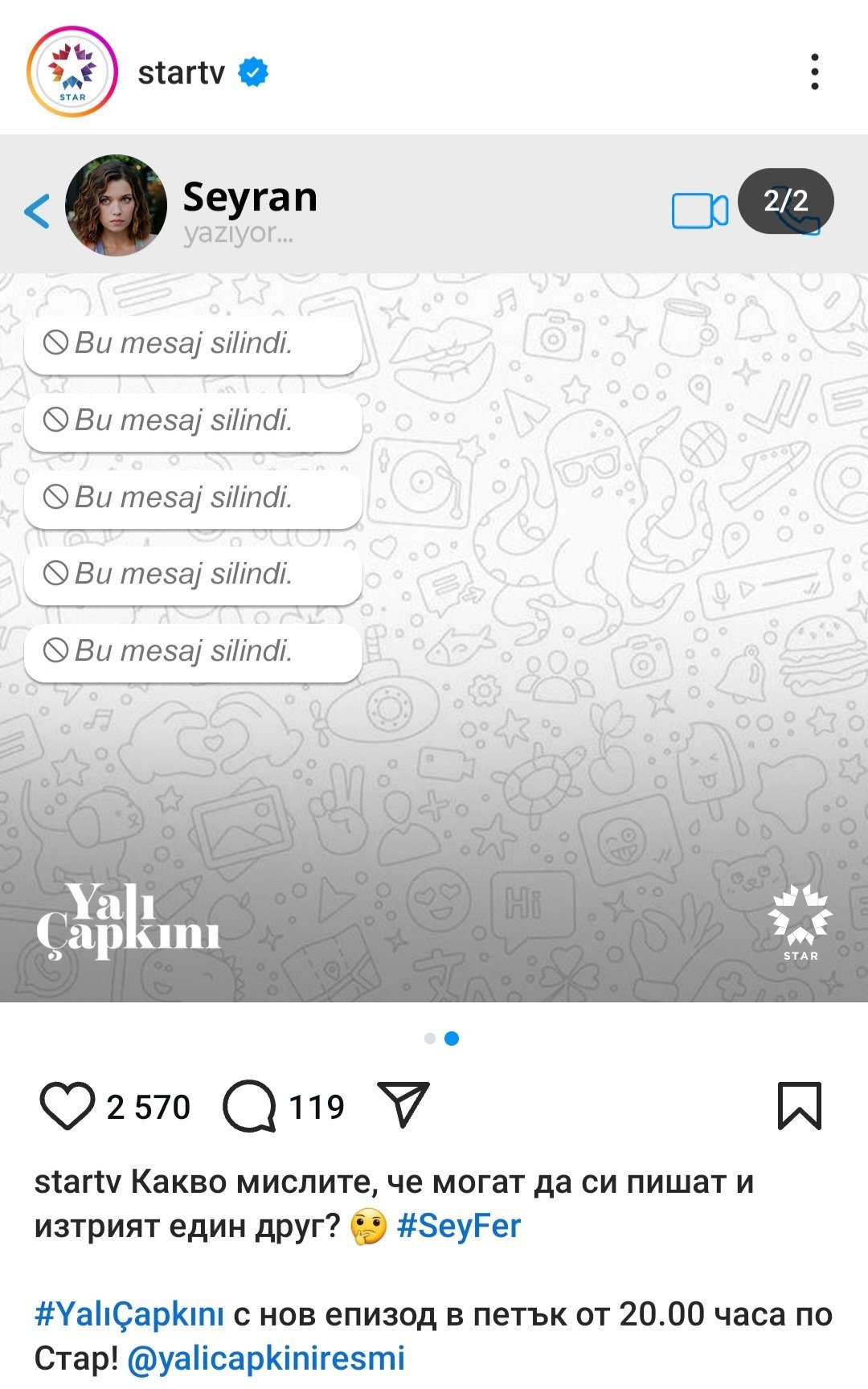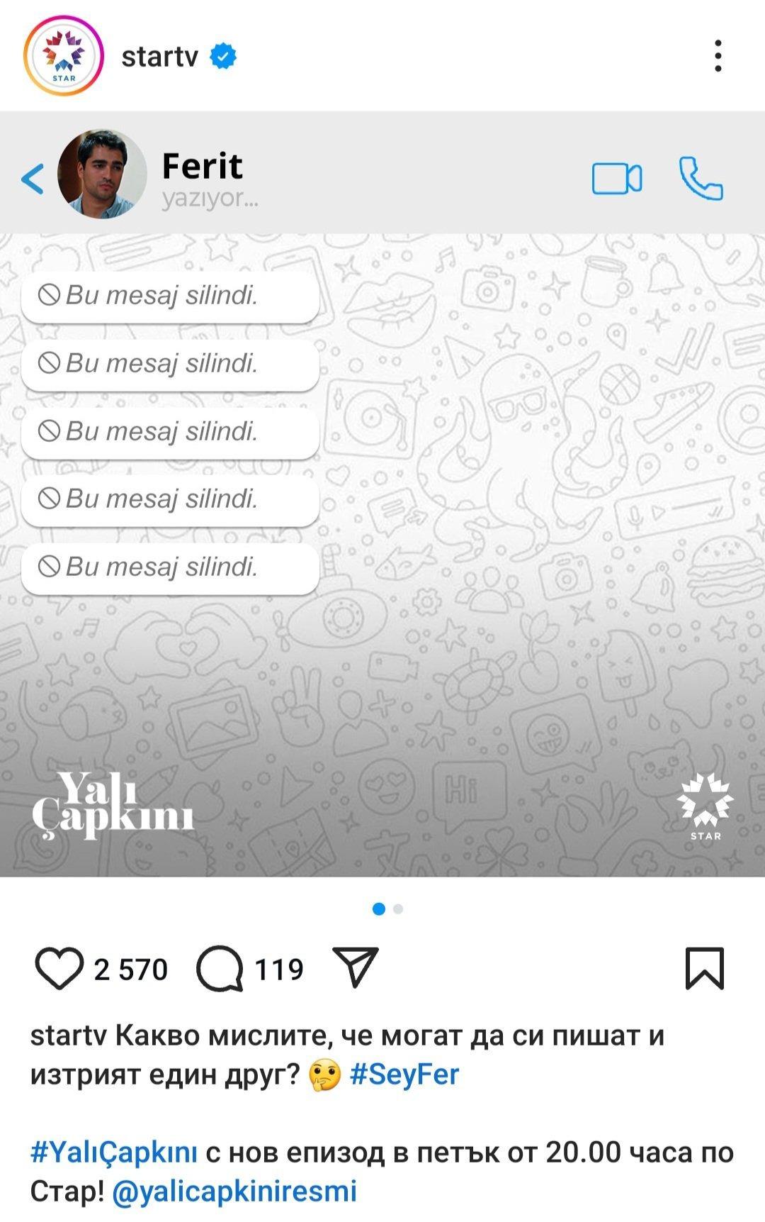Мистери,той,/Синанчо де/,много добре си знае Сейран кого обича и се ядосва,че игричките и манипулациите му ще ударят на камък.Но на мен друго не ми дава мира.Дали,когато я удари,/ако е верен спойлера де/,тя ще реагира така както реагира в тази ситуация с Ферит или ще лъже,че се е ударила във вратата на колата и ще продължи "романа си".Дали,за нея,това ще е преломния момент в който да види истинското лице на Синан и да го игнорира и тогава Ферит да тръгне да я "спасява" от него и семейството му?Говори се,че този път тя ще е тази,която ще се бори за Ферит,което много не ми се вярва.Ще видим колко пъти ще променят сценария.Относно "клюката",че тоя Джем "импровизирал" с докосванията си,хич и не ми се вярва.Вижда се колко е уплашен и вдървен,че е попаднал в сериала.Дори играта му не се получава,да не говорим за някакви "импровизации".Едва ли някой от екипа ще допусне такова нещо и то да се случва с главната героиня.Но въпреки минималния шанс да се е случило,означава,че тоя няма да изкара много серии.Никоя продукция няма да си позволи главните му герои да се чувстват дискомфортно на снимачната площадка  заради някакъв си второстепенен герой,който още с влизането си е "ненавиждан" от феновете и то главни герои,които основно изнасят на гърба си целия сериал.Даже,след тази "прословута" първа серия и негодуванието,след почти никаквите рейтинги ще намалят до минимум докосванията с новите.
