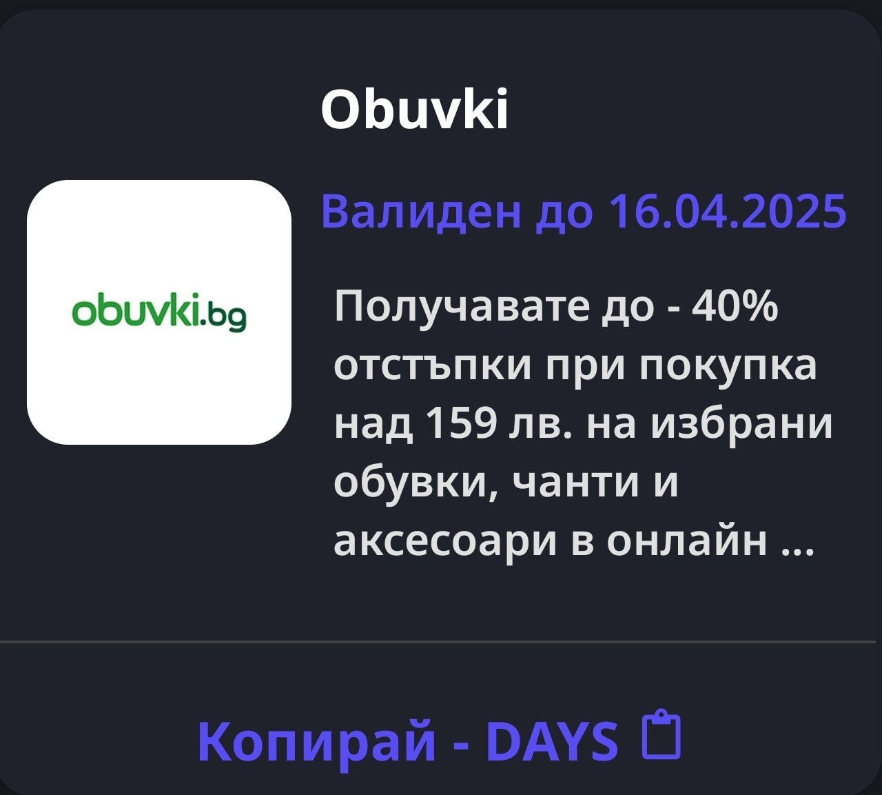 Върнах онзиден последната си поръчка със сандали Clarks. Ми във Fashion days бяха 125 към 159 в obuvkibg. Върнах ги и си ги поръчах от Fashion days. Прекаляват малко.