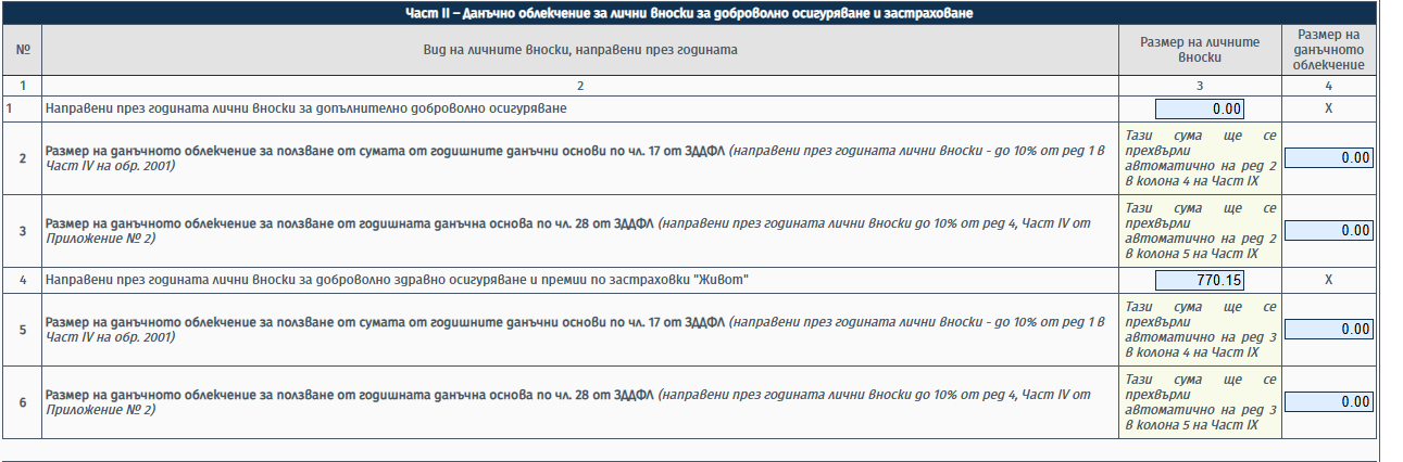 но в част IX Данъчно облекчение за лични вноски за доброволно здравно осигуряване и застраховки "Живот" клетката е неактивна, не се и зарежда автоматично.