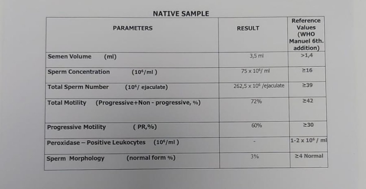 Здравейте! С ММ правим опити за дете от около година. До момента само аз съм правила изследвания за изясняване на инфертилитета. Имам аденом на хипофизата, който отделяше пролактин и го лекувам с бромокриптин. Посъветваха ни и съпругът ми да направи изследвания, като не всички са излезли все още. Бях се фокусирала върху своите здравословни проблеми и мислих, че само заради мен не се получават нещата. За жалост май не е така.  Ще се консултираме и с лекар, но по празниците няма как. Резултатите малко ме притесняват и обезкуражават. Едно нещо вкараме в норма и друго се появява.  Изобщо не съм и запозната при мъжете дали е възможно да се оправят репродуктивните проблеми. Според вас има ли шанс за естествено забременяване при такива резултати?