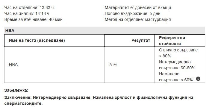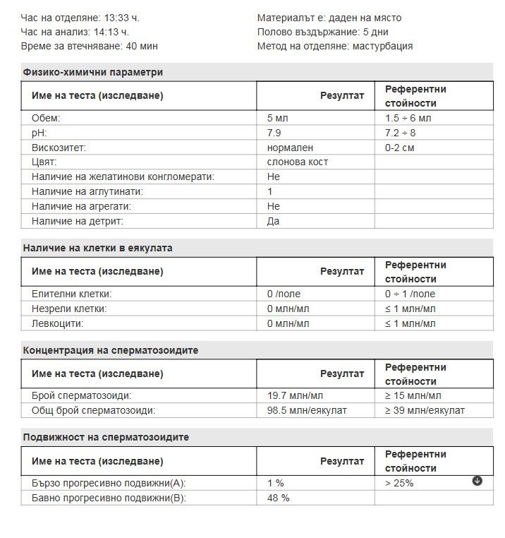 Иначе самата тя е ок. Морфологията се компенсира от броя, бих казала че това, че няма бързо прогресивно подвижни е пробле, но щом сте забременяла няколко пъти очевидно не е във вашия случай.