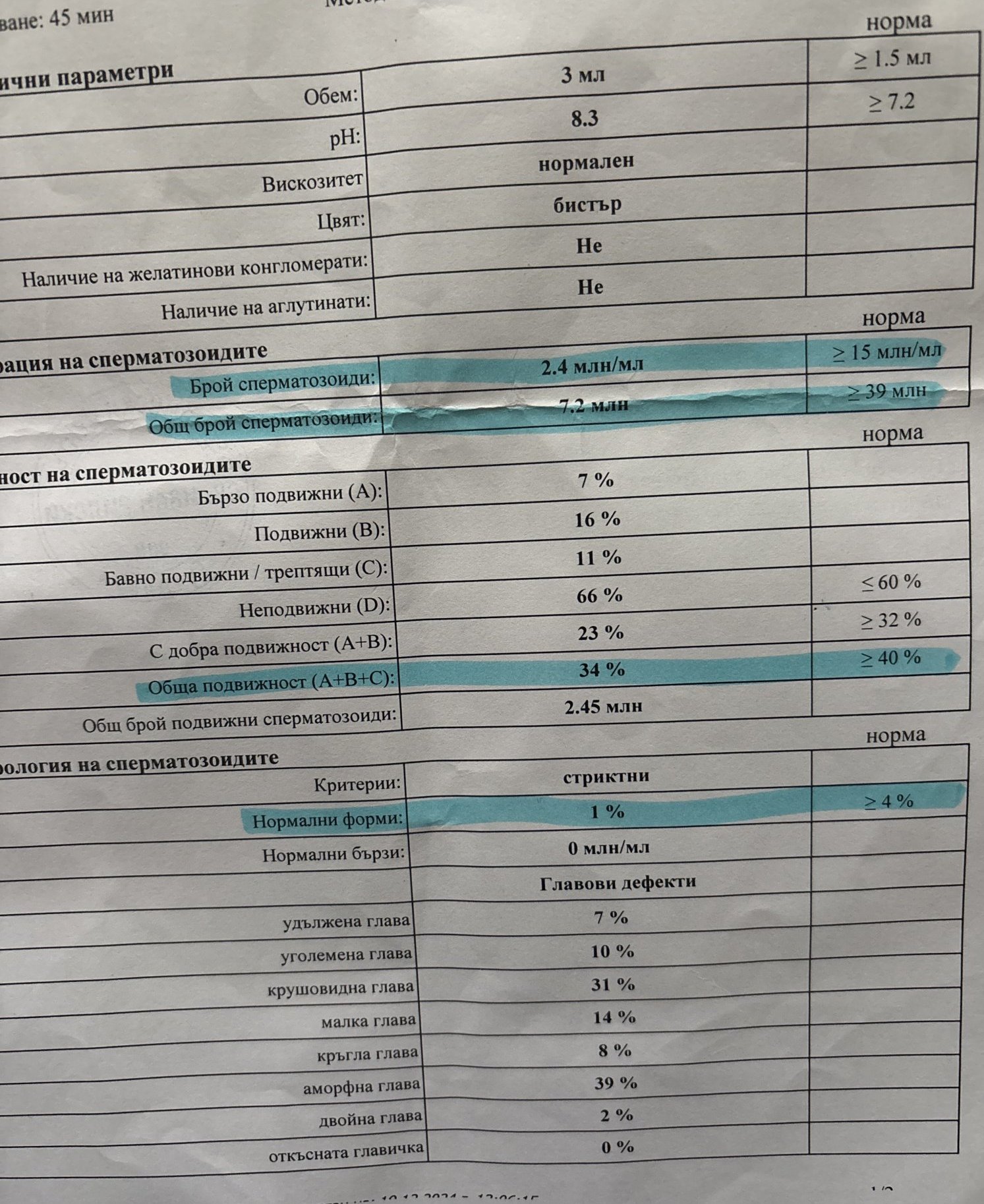 Здравейте! Моля за мнение за СГ на мъжа ми, която е пусната почти 3 месеца след последната. Ще приложа и предната СГ. Имаме одобрение от Фонда, миналият месец трябваше да започнем инвитро процедура, но направих биохимична Б и следователно отложихме опита за Март. Според вас възможно ли е естествено забременяване или по-скоро да пристъпим към инвитрото? Правим опити от 8 месеца, като реалното подобрение в СГ е за последните 3 месеца.