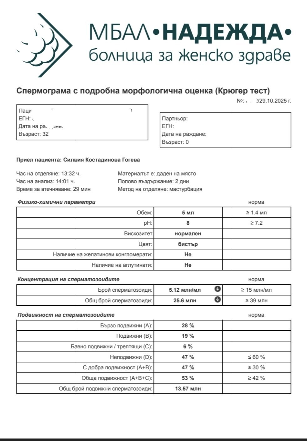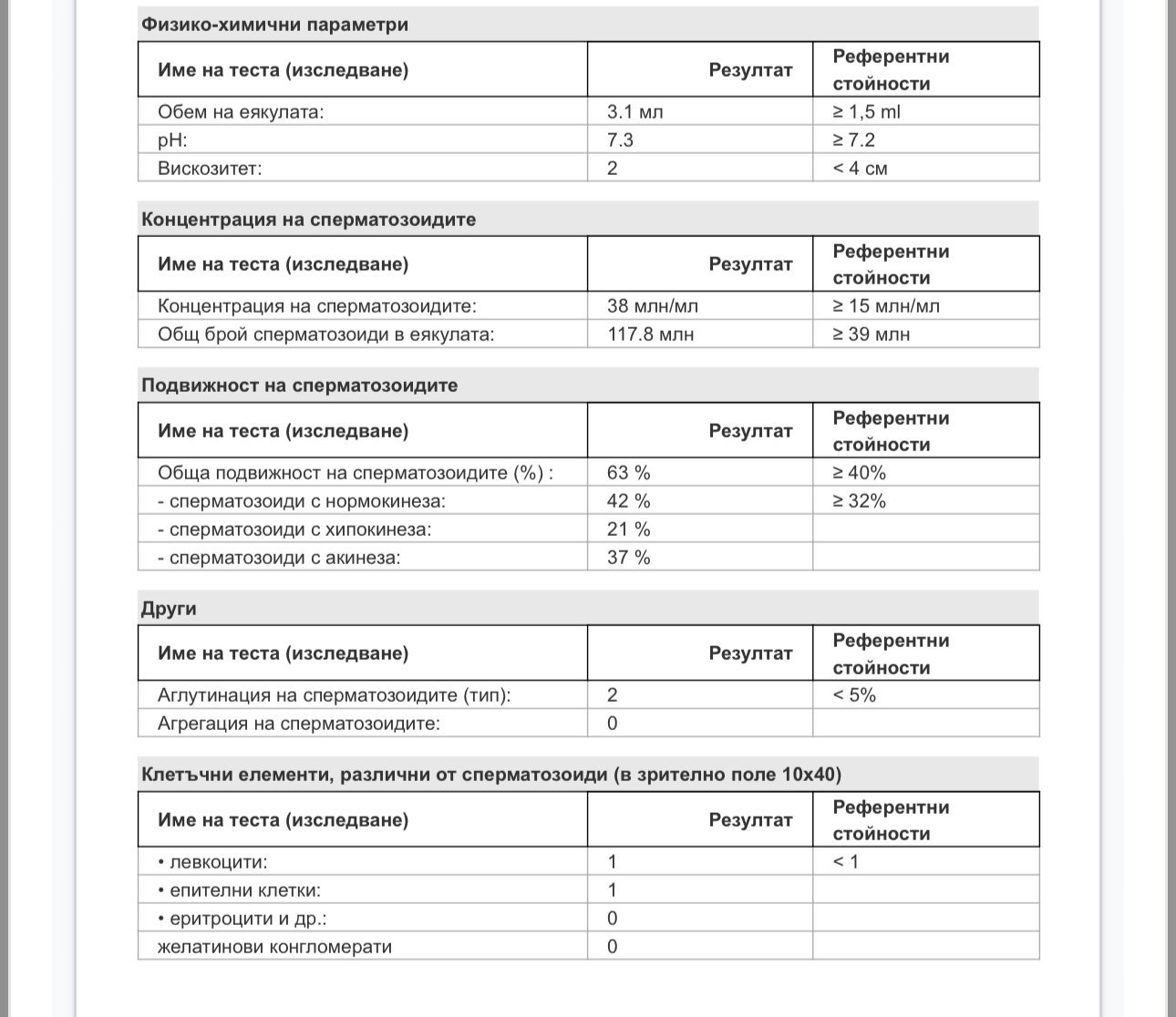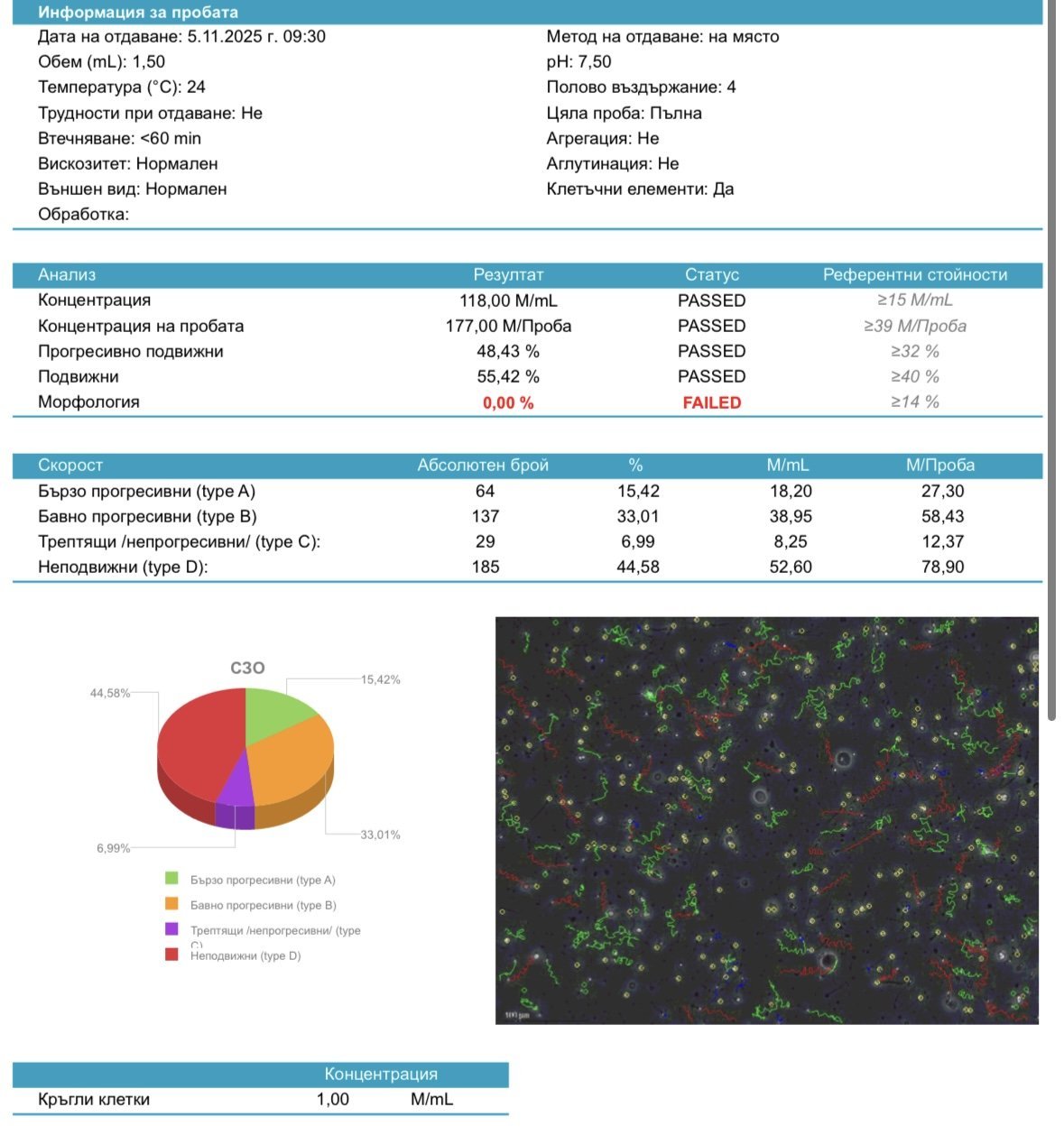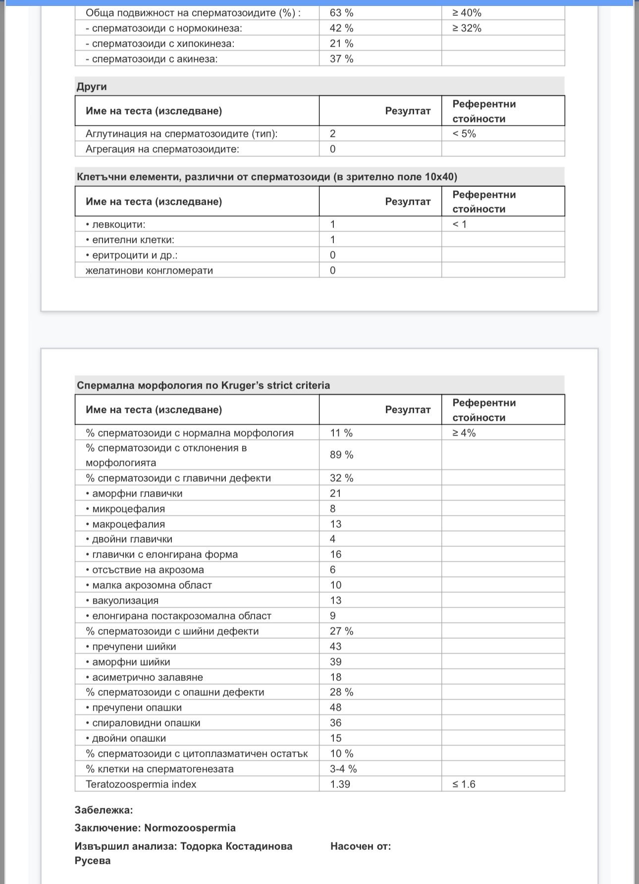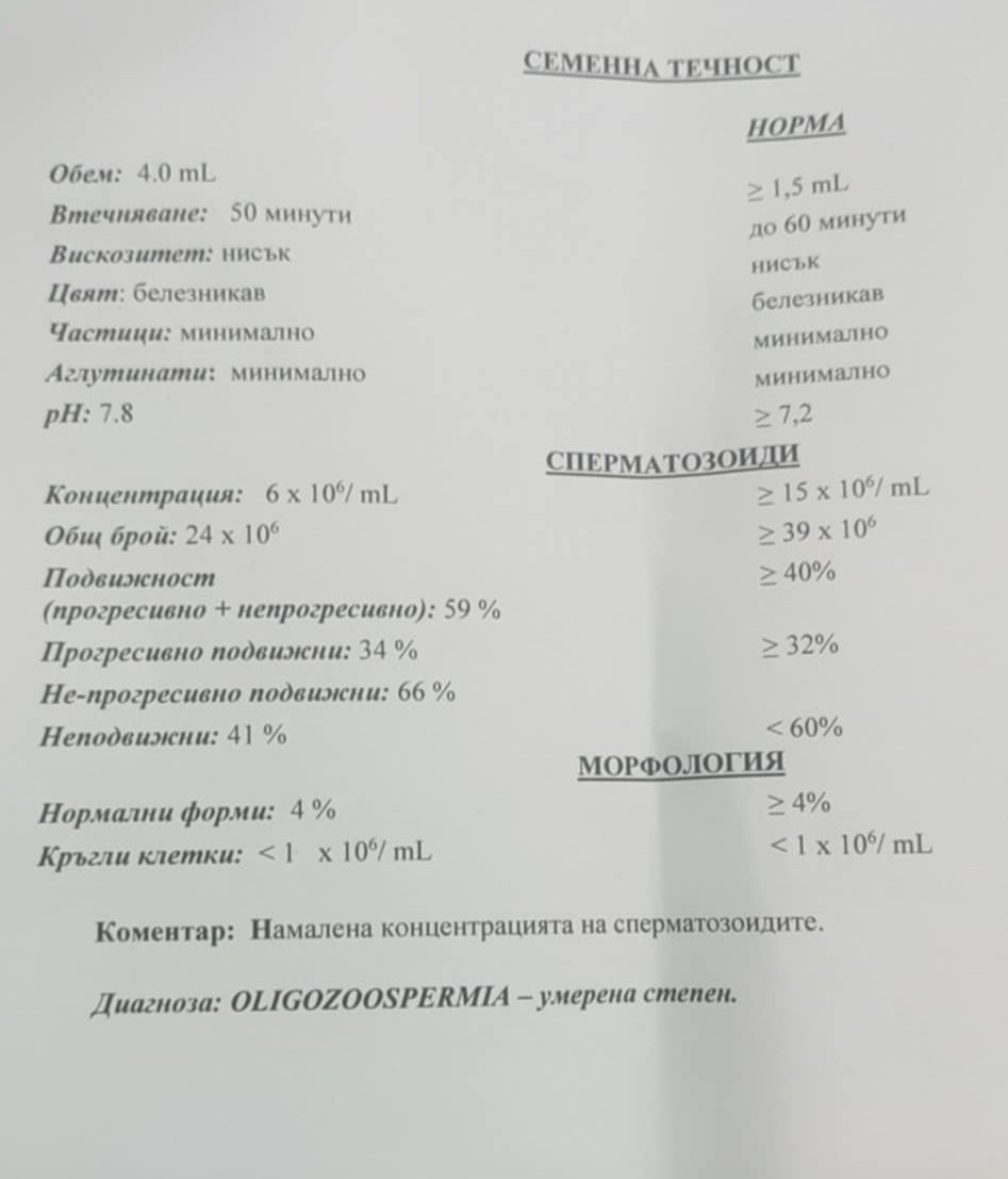 Опитваме за бебе от февруари 2023, една биохимична бременност за 1 година и през април 2024 започнахме да търсим репродуктивен. Първата ни спермограма в Бургас показа около 68 милиона в мл, общо 100 млн за пробата и морфология 1%. Стреснахме се почна добавки съпруга ми и след няколко месеца повторихме в Солун. Резултата беше подобен, но морфологията беше 2% (там гледа човек, а не апарат) като там пуснахме и ДНК фрагментация която беше 12% и ни казаха че е добре. Няколко месеца по- късно започнахме инсеминации и имаме 3 до сега, защото дебнем за дясна проходима тръба. Този месец решихме да направим нова спермограма, понеже не сме правили от 1 година и ни предстои ин витро и се стреснах. Морфология 0% Sad
