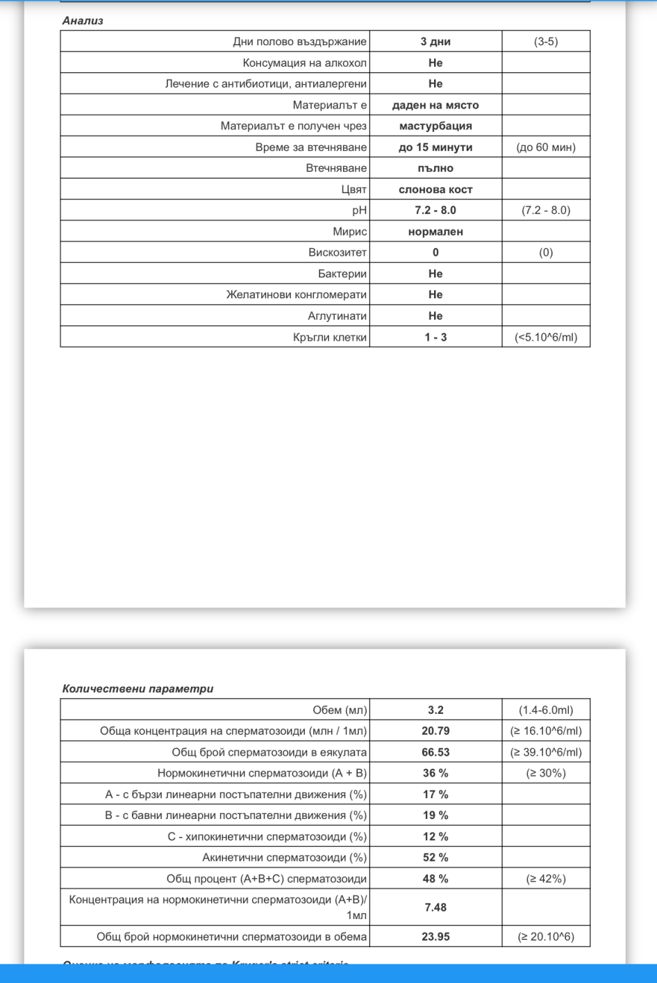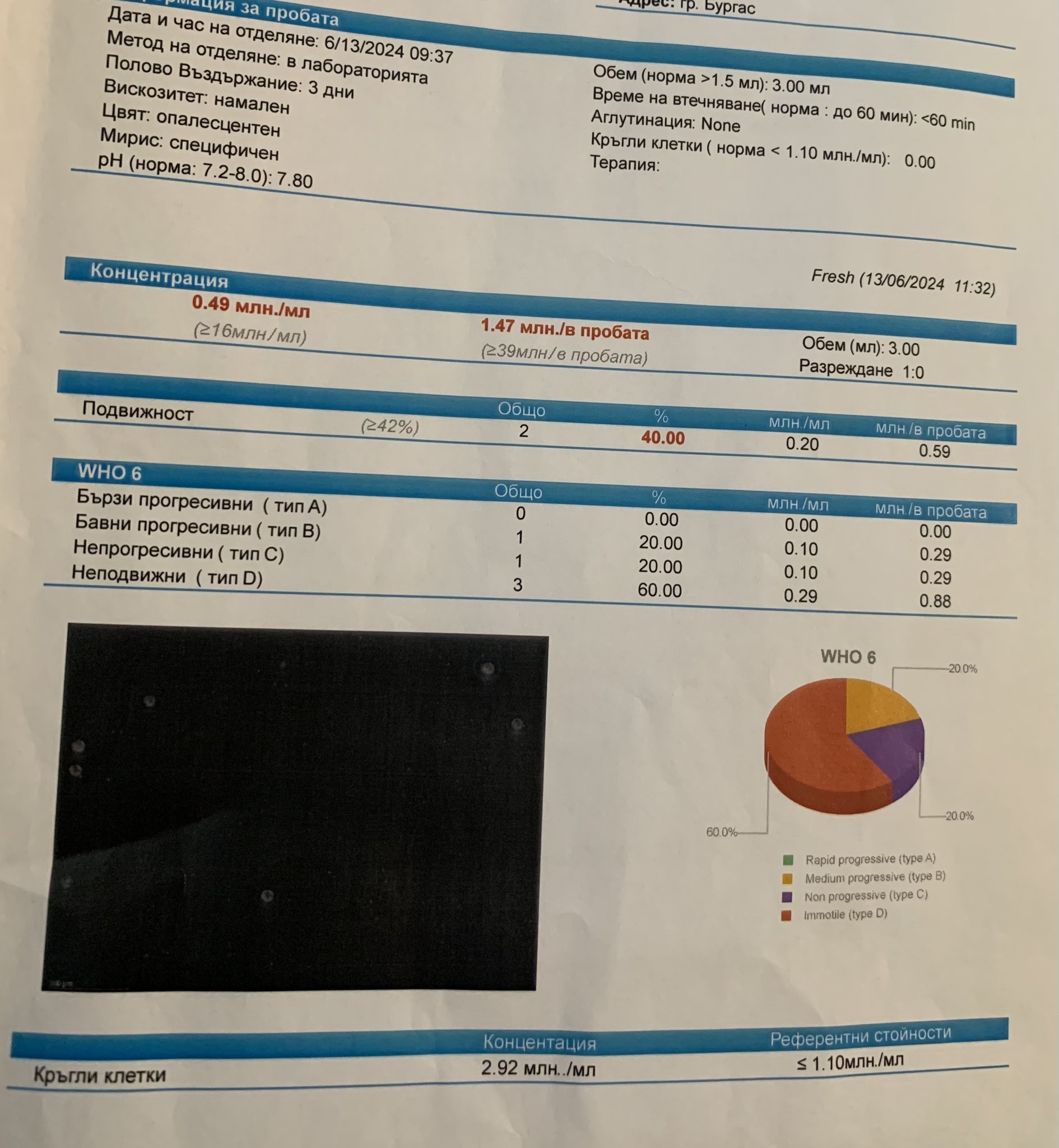 Здравейте! Пиша във връзка с няколко поредни много лоши спермограми. Прикачила съм снимки към изследванията. Пускали сме разширени с морфология, пуснали сме тест за оксидативен стрес, NAG, Fructose, Androflor screen, в лаборатория сме пуснали също доста неща. При уролог минахме, варикоцеле е отхвърлено като възможност. ММ е на 28г., не пие, не пуши, активен начин на живот винаги, спортува редовно.  Първата я пуснахме на 04.09.24г след като осъзнахме, че имаме реален проблем и не ни се случва чудото. След абсолютен шок от резултатите пуснахме 2ра на 09.09.24г. за да видим да не е станала грешка, но не беше. Пие прахчета Променк от Турция от тогава, мина терапия назначена от ендокринолог с Клостилбегит и накрая просто няма никакъв резултат, резултатите са същите. Записали сме час в Щерев при д-р Бъчваров за консултация и лечение в последствие. Кажете, моля ви, какво сме пропуснали като стъпки, какво мислите вие според вашият опит и наистина ли е чак толкова зле, колкото изглежда?