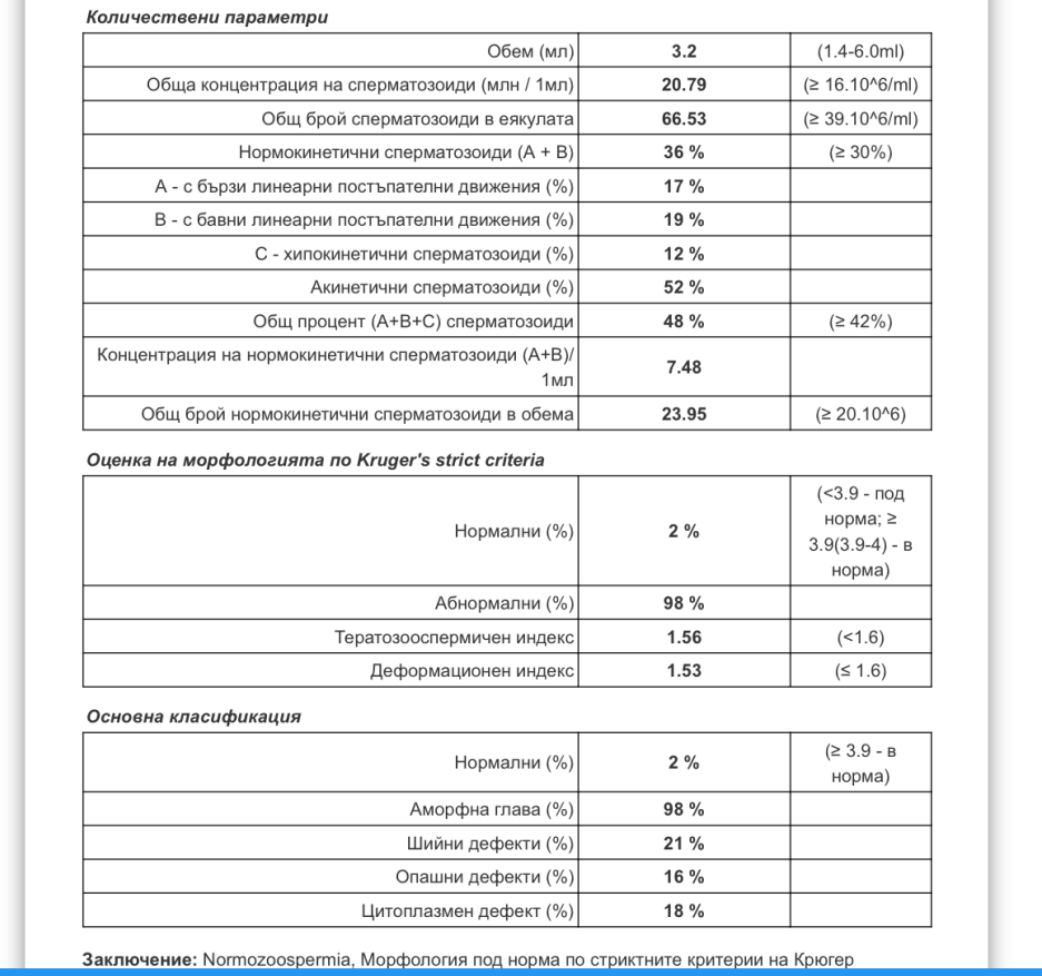 Разбирам желанието за бързо и лесно естествено забременяване, и че всеки се надява на чудеса, но истината е, че при спермограми като на MADJAROVA това са по-скоро изключения отколкото правило и е важно човек да има реална преценка на ситуацията.