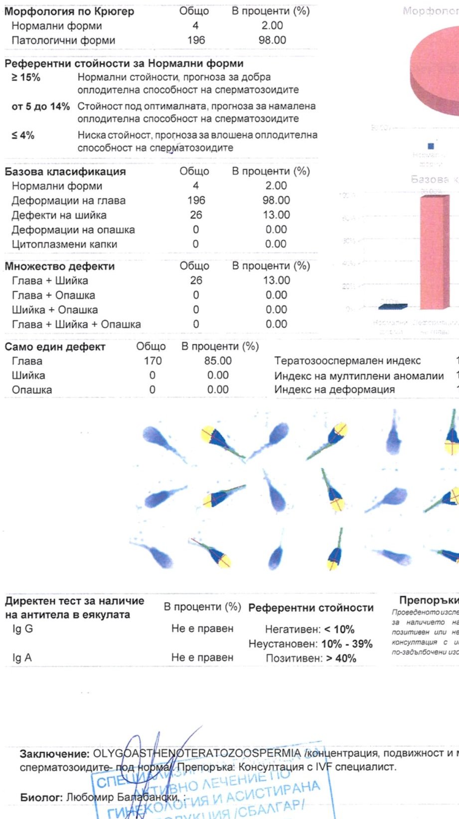 Всичките спермограми и по-специфични изследвания са правени в Клиничен институт по репродуктивна медицина- гр. Плевен.