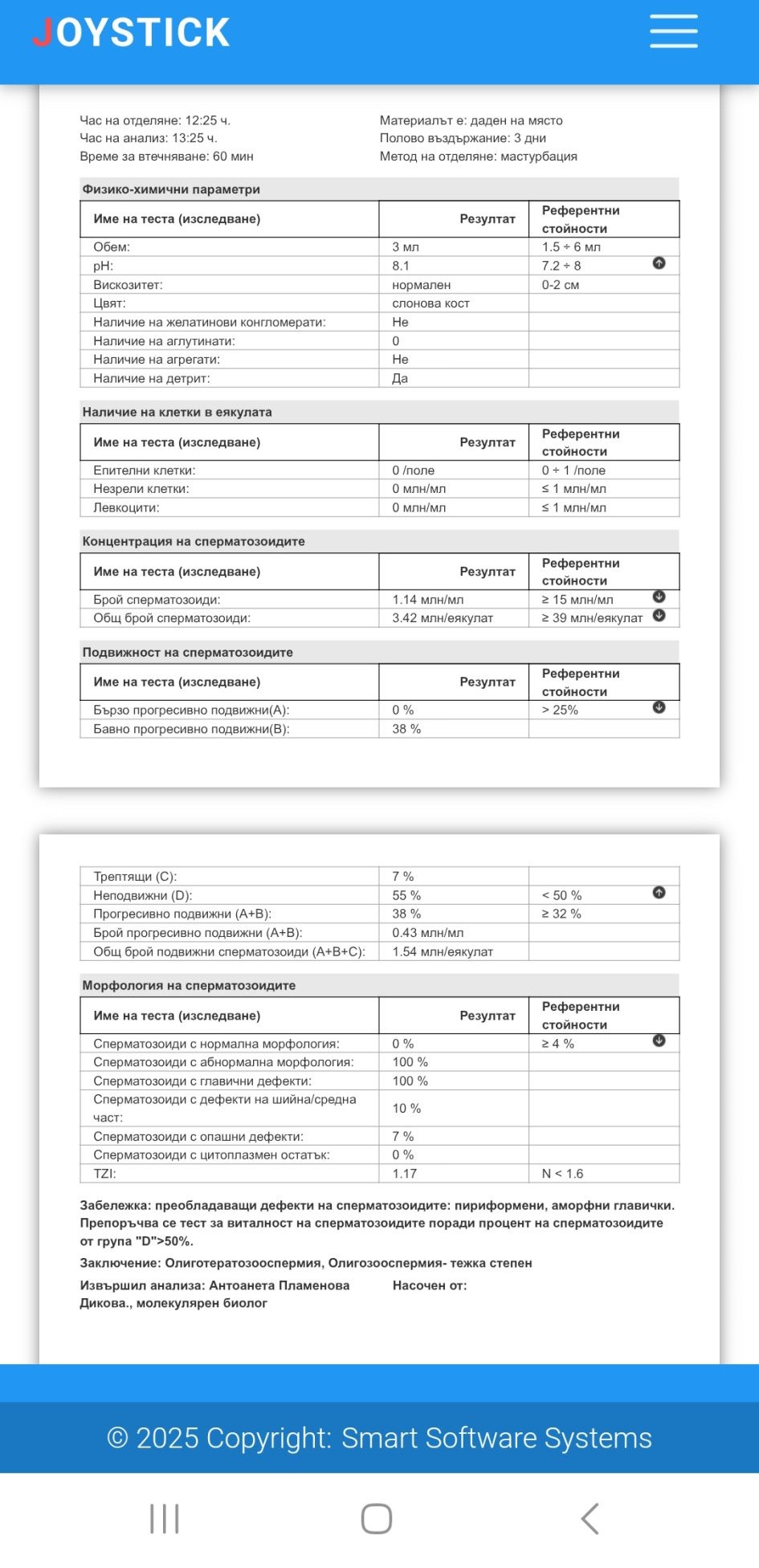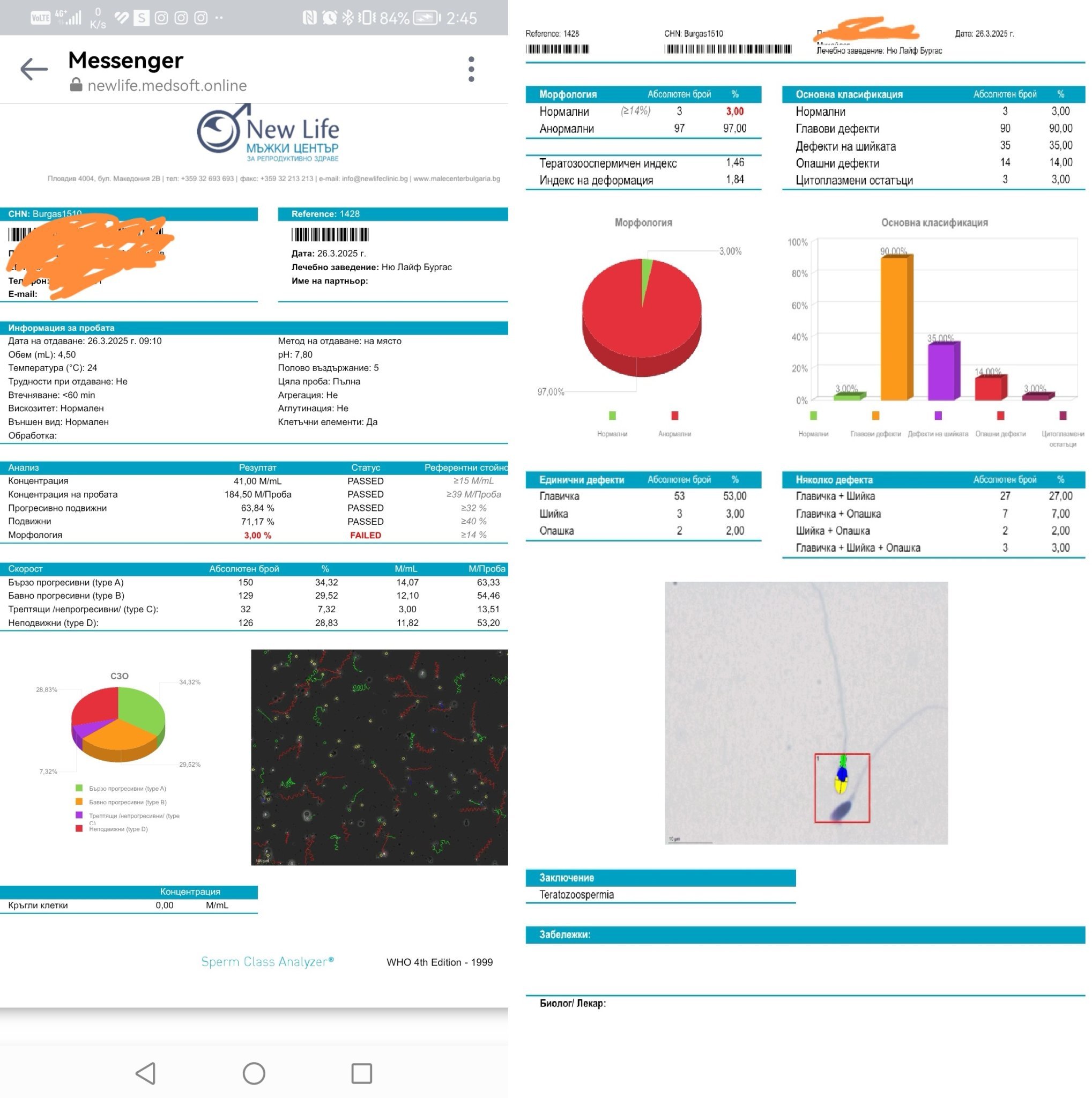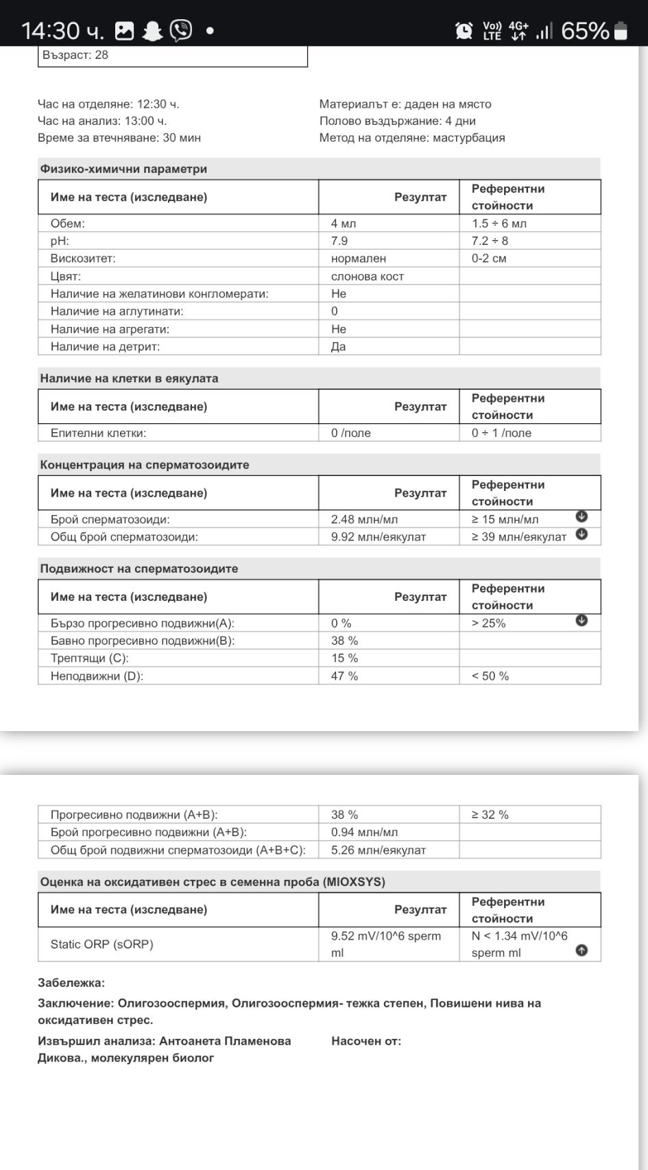Здравейте! Пиша във връзка с няколко поредни много лоши спермограми. Прикачила съм снимки към изследванията. Пускали сме разширени с морфология, пуснали сме тест за оксидативен стрес, NAG, Fructose, Androflor screen, в лаборатория сме пуснали също доста неща. При уролог минахме, варикоцеле е отхвърлено като възможност. ММ е на 28г., не пие, не пуши, активен начин на живот винаги, спортува редовно.  Първата я пуснахме на 04.09.24г след като осъзнахме, че имаме реален проблем и не ни се случва чудото. След абсолютен шок от резултатите пуснахме 2ра на 09.09.24г. за да видим да не е станала грешка, но не беше. Пие прахчета Променк от Турция от тогава, мина терапия назначена от ендокринолог с Клостилбегит и накрая просто няма никакъв резултат, резултатите са същите. Записали сме час в Щерев при д-р Бъчваров за консултация и лечение в последствие. Кажете, моля ви, какво сме пропуснали като стъпки, какво мислите вие според вашият опит и наистина ли е чак толкова зле, колкото изглежда?
