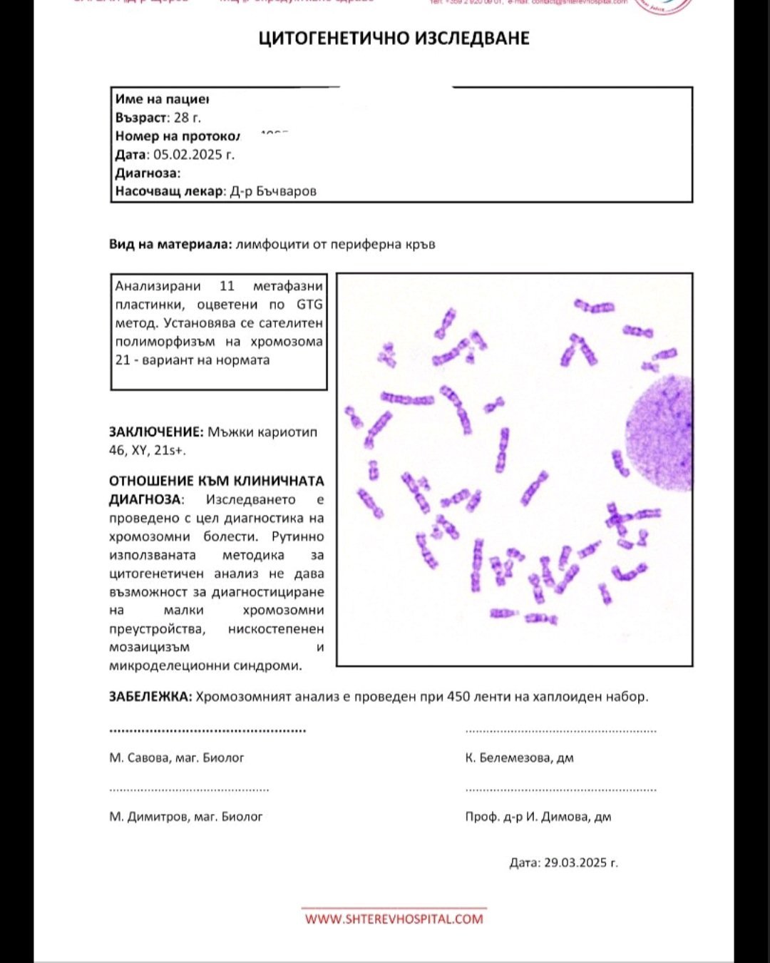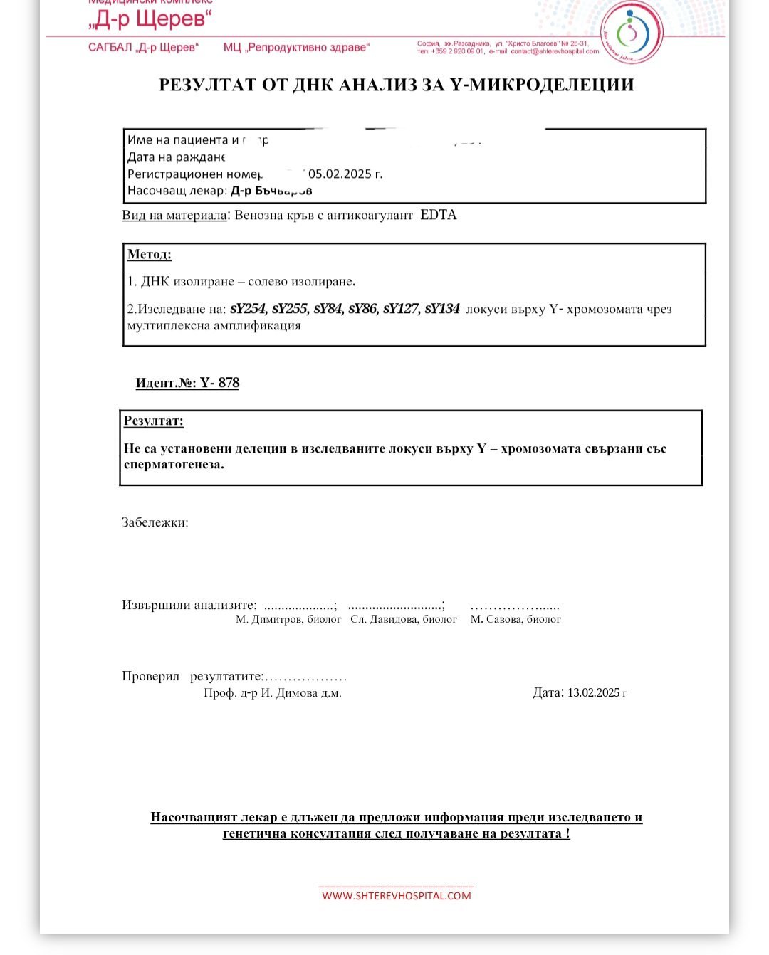 Пуснахме цитогенетично изследване, ДНК анализ за муковисцидоза, ДНК анализ за У- микроделеции и ги прикачвам отново.
