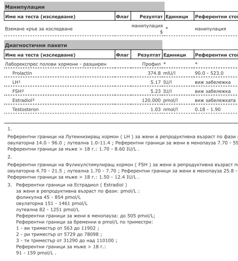 Моите изследвания са изненадващо добри за човек доскоро на КС! Преди 2 години лх:фсх ми е било 1:2, а сега май е както трябва, а пролактина преди година беше към 500.. Естрадиола е бил 50, сега всякаш е по-добре. Слагам в скрит текст: