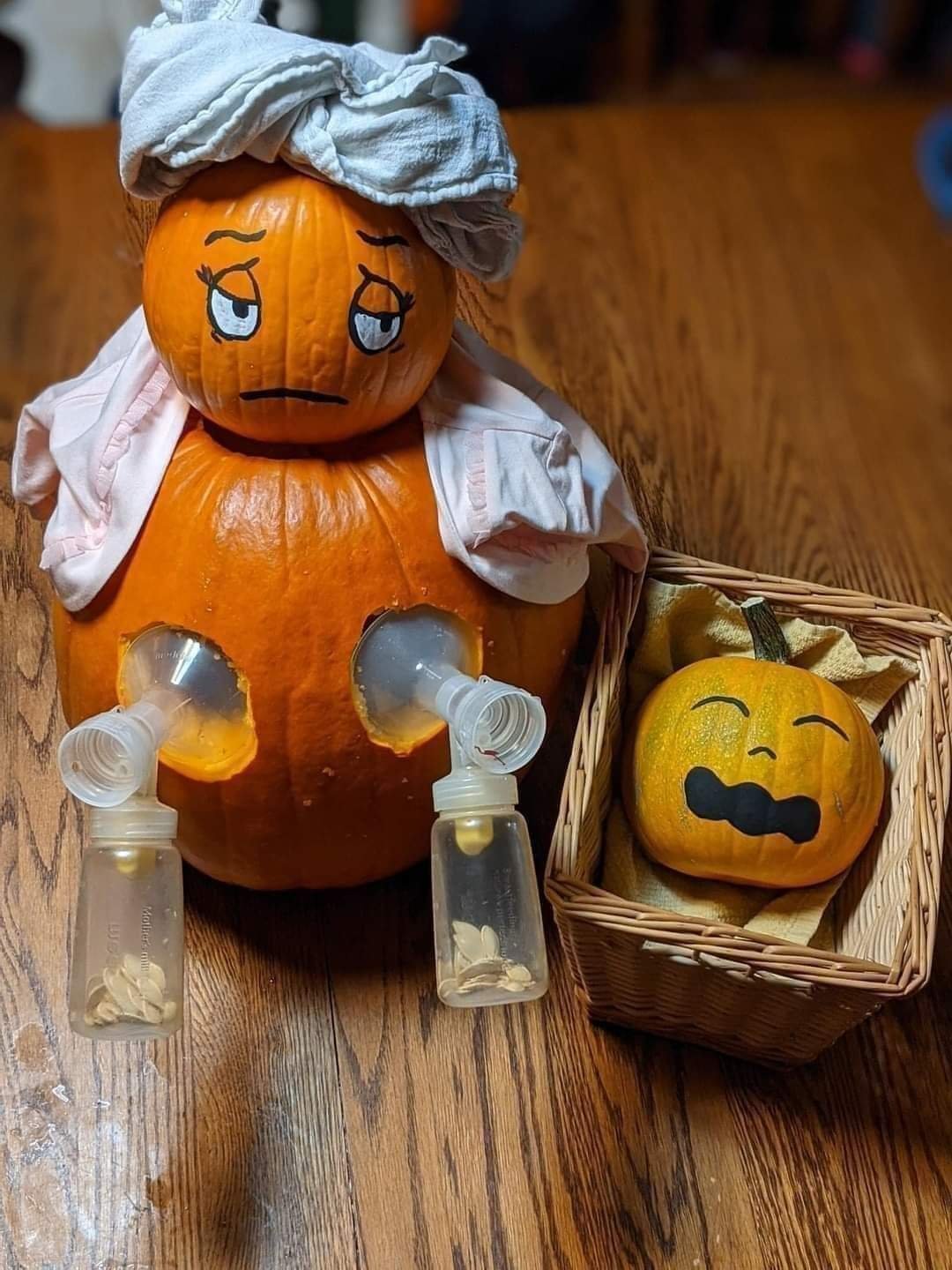Пия си хаповете за кърма и се цедя между 150-180мл, все още не давам АМ почти. Трупам кърма в хладилника, мъжа ми се спуква от смях, на хелоуин ми прати тая снимка