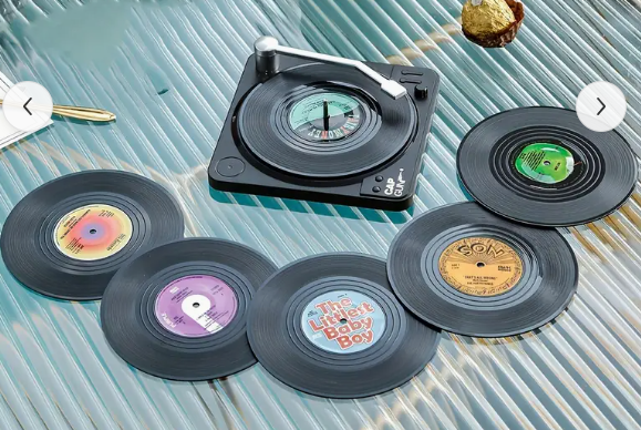 не знам дали е приложимо, но за едно младо семейство (първа Коледа като семейство) поръчах от тему подложки за сервиране. Те са музиканти и са запалени по виниливи грамофонни плочи, затова избрах няколко размера, все кръгли грамофонни плочи - едните са за чаши - те са със "стойка" - грамофонче, събират се върху нея, ето такива: