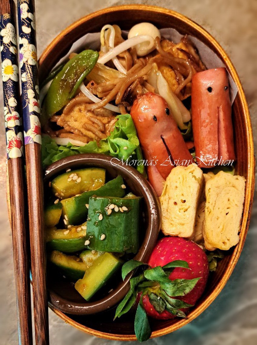 И японско бенто  Соба нудли с тофу, зленчуци ( бок чой, снежен грах и зелен лук) и гъби Еноке; салата с мачкана краставица; "октоподчета" Тамагояки омлет; ягода