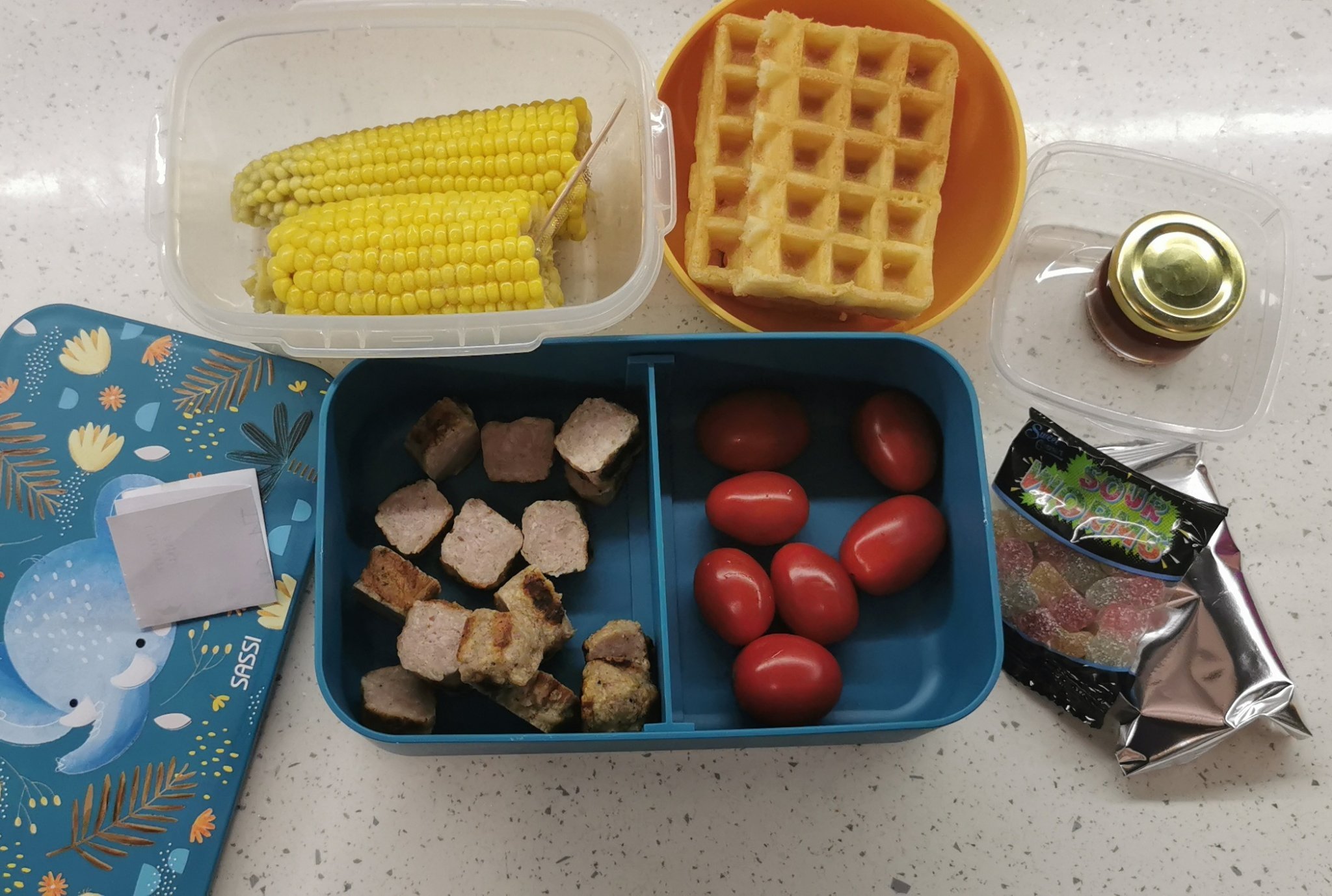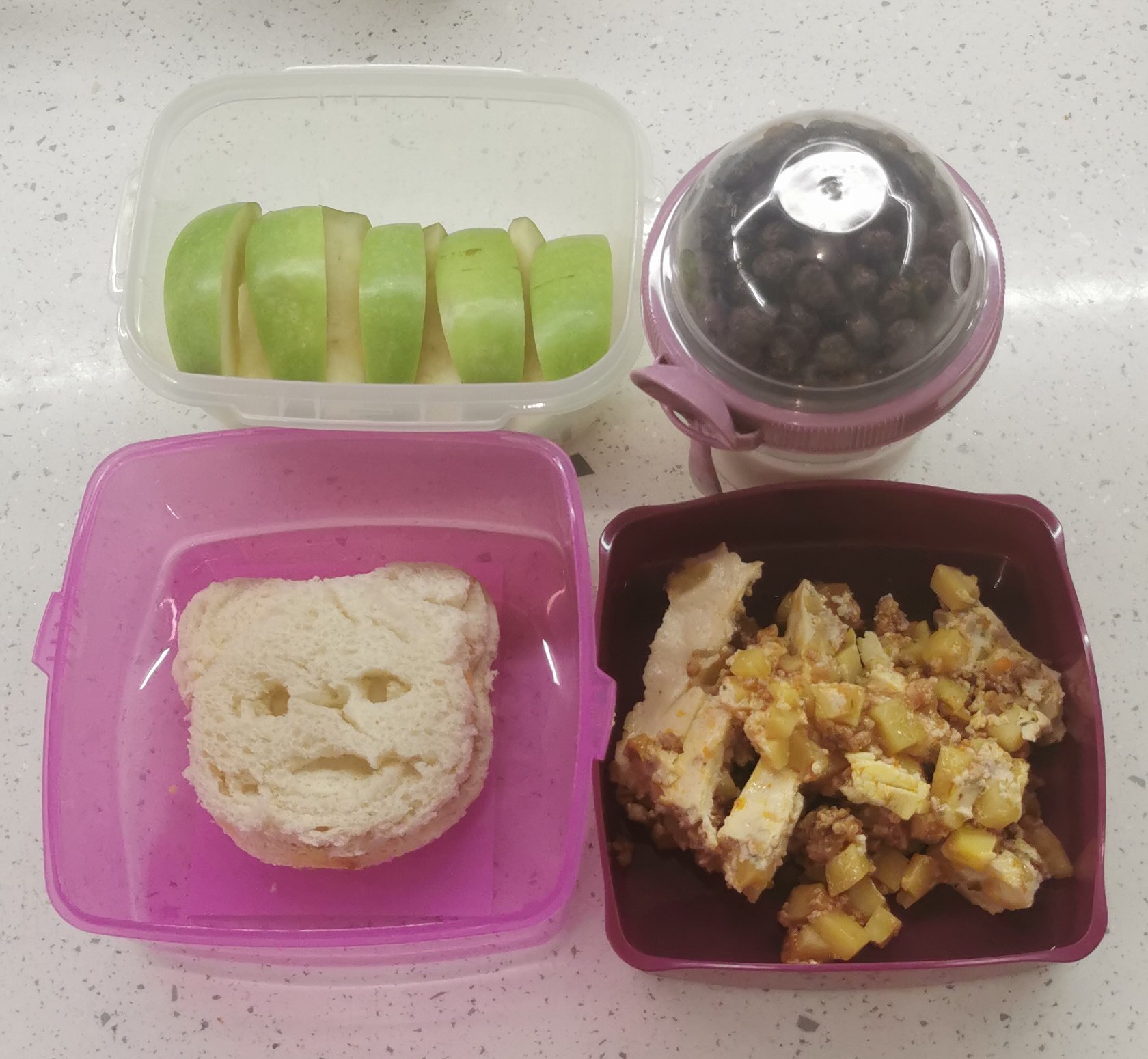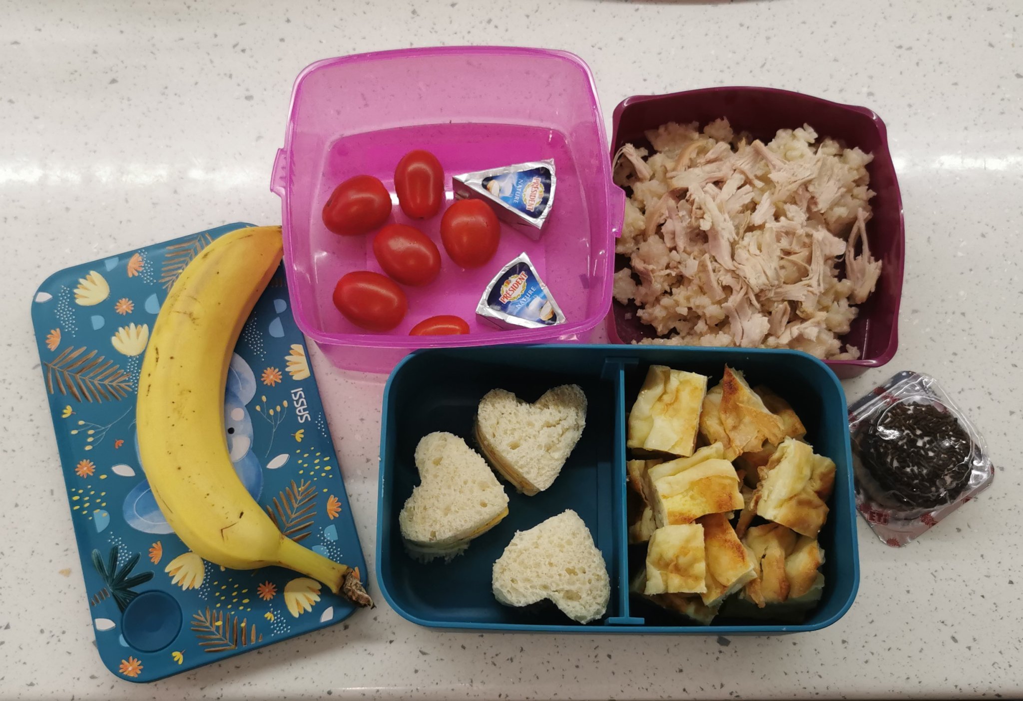 От вчера имаме хладилник, та днес в една от кутиите хлапето има сандвич с домашен хляб, крема сирене, шунка и чери домати, а в другата - домашни мъфини с боровинки и нарязана нектарина.