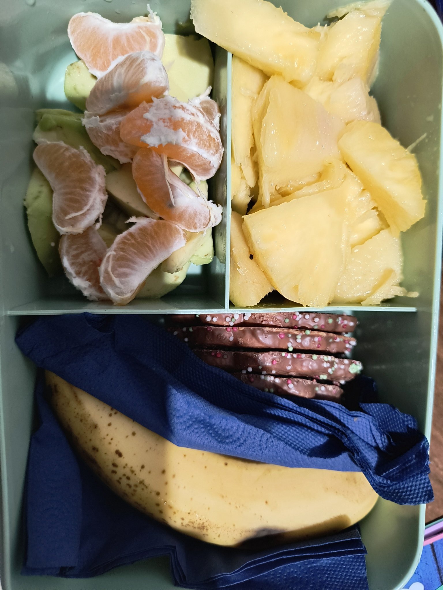 Днес беше на основно плодова закуска - авокадо (не го е изял, а уж му хареса), манго, ананас, мандарина и банан. две бисквитки.
