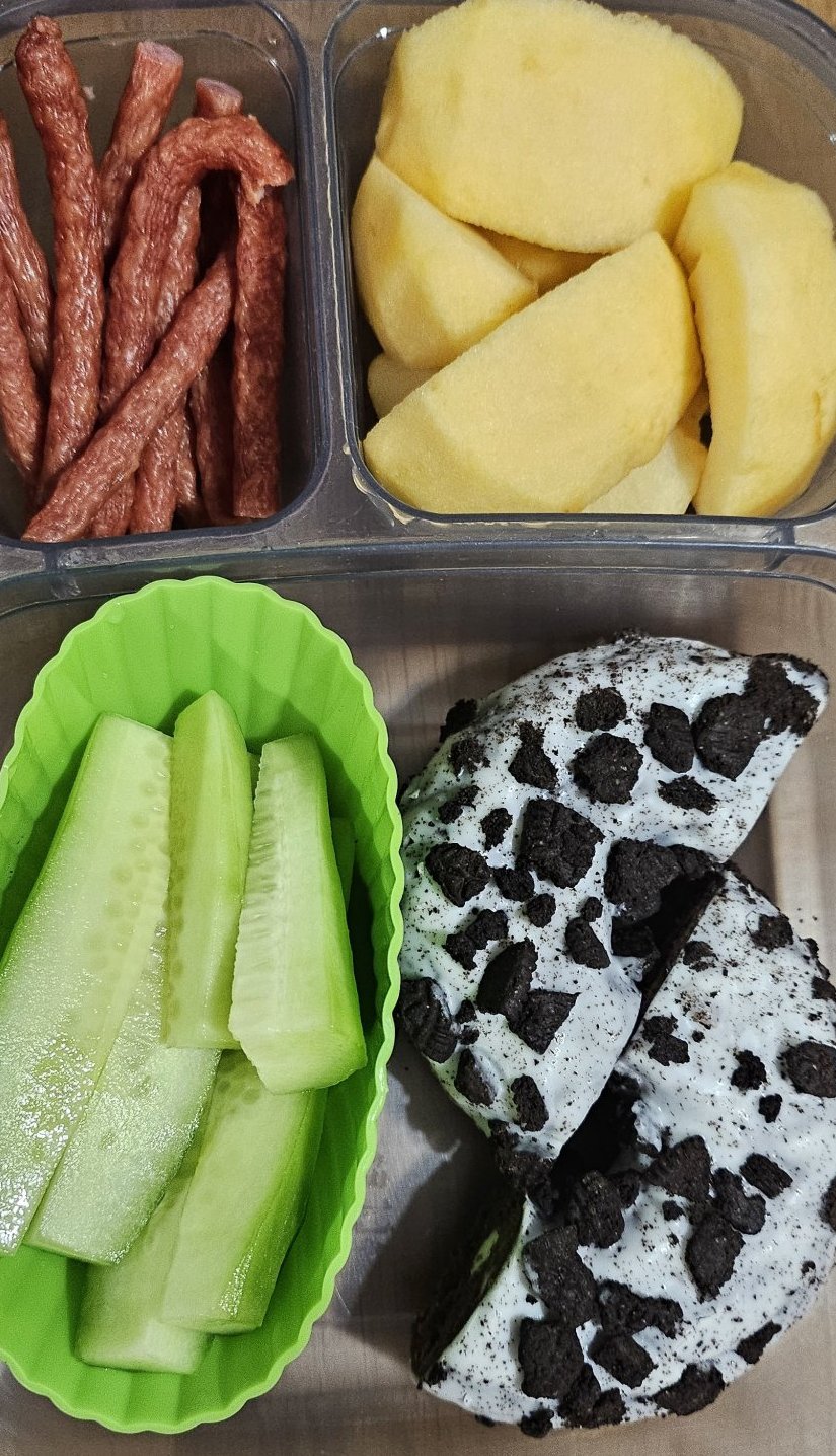 За утре-кекс,кифлички със крем Ванилия и извън кадър ябълка и вафла.