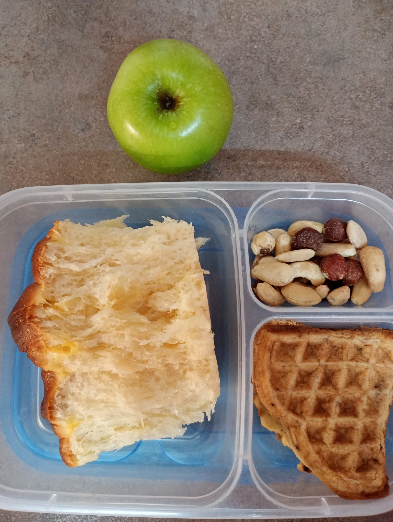 Парче от питка със сирене,която правих вчера, гофрети с шоколад, сурови ядки,ябълка.