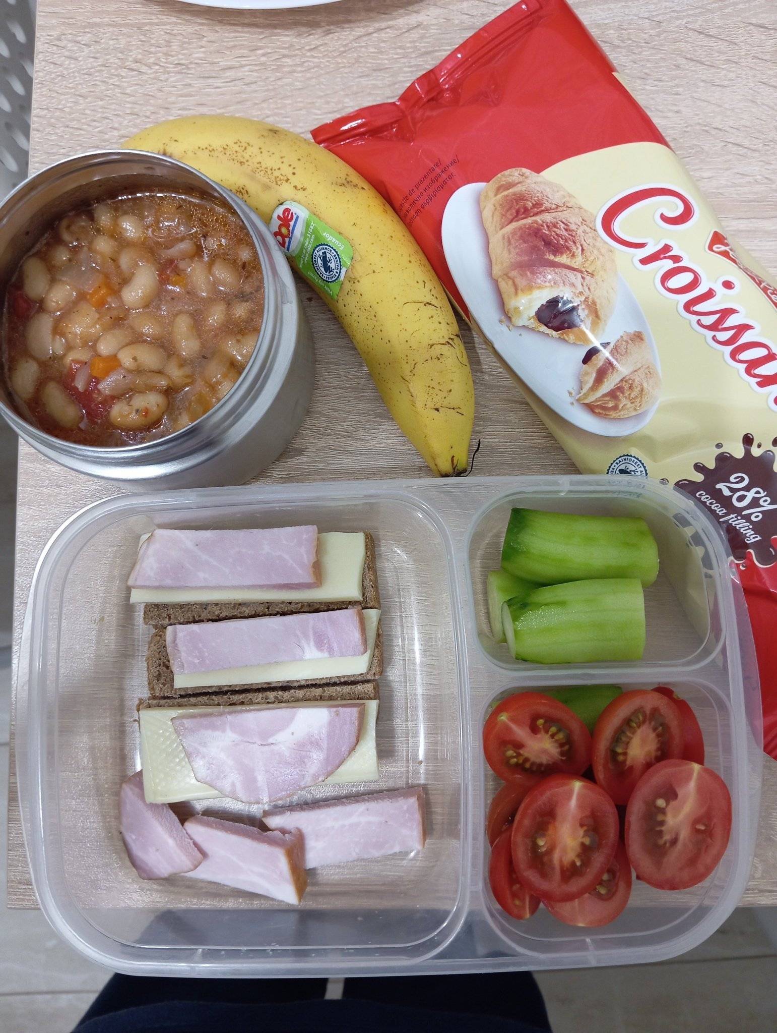 За днес кутия със сандвич и малко краставичка и чери домати.