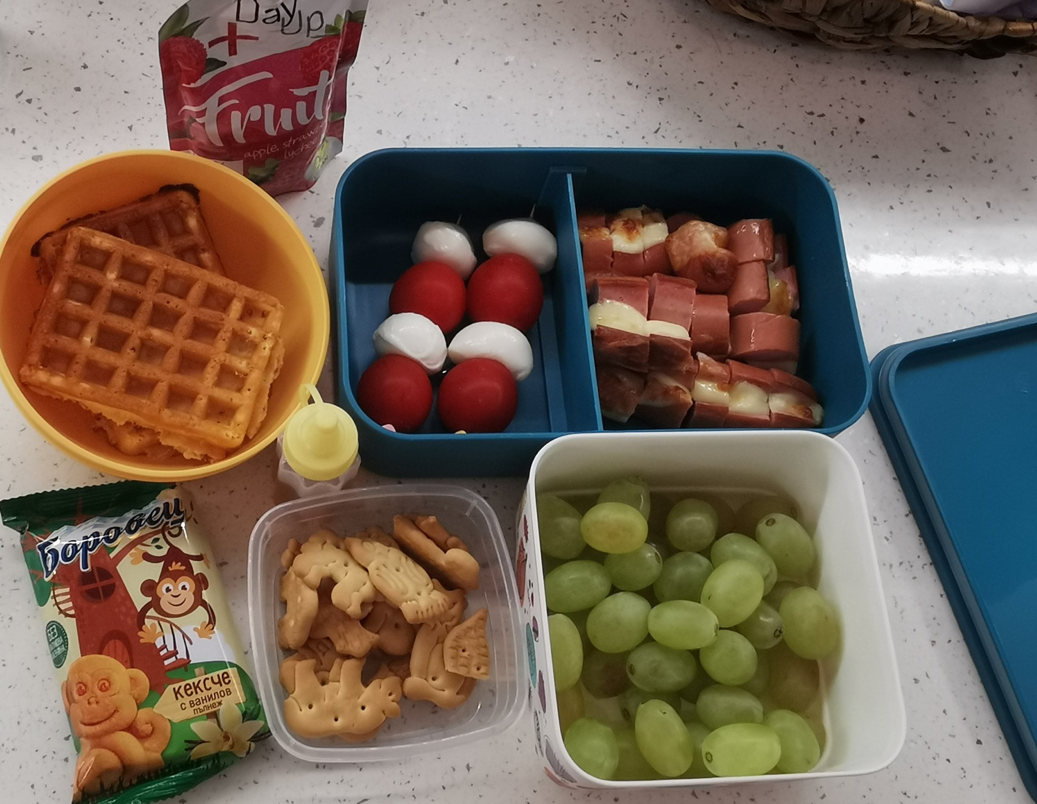 В кутията има палачинка със сирене, грозде, бисквити с фъстъци и кабаноси. Отделно в чантата с храната има печен "слепен" сандвич, поничка орео от лидл, и банан.