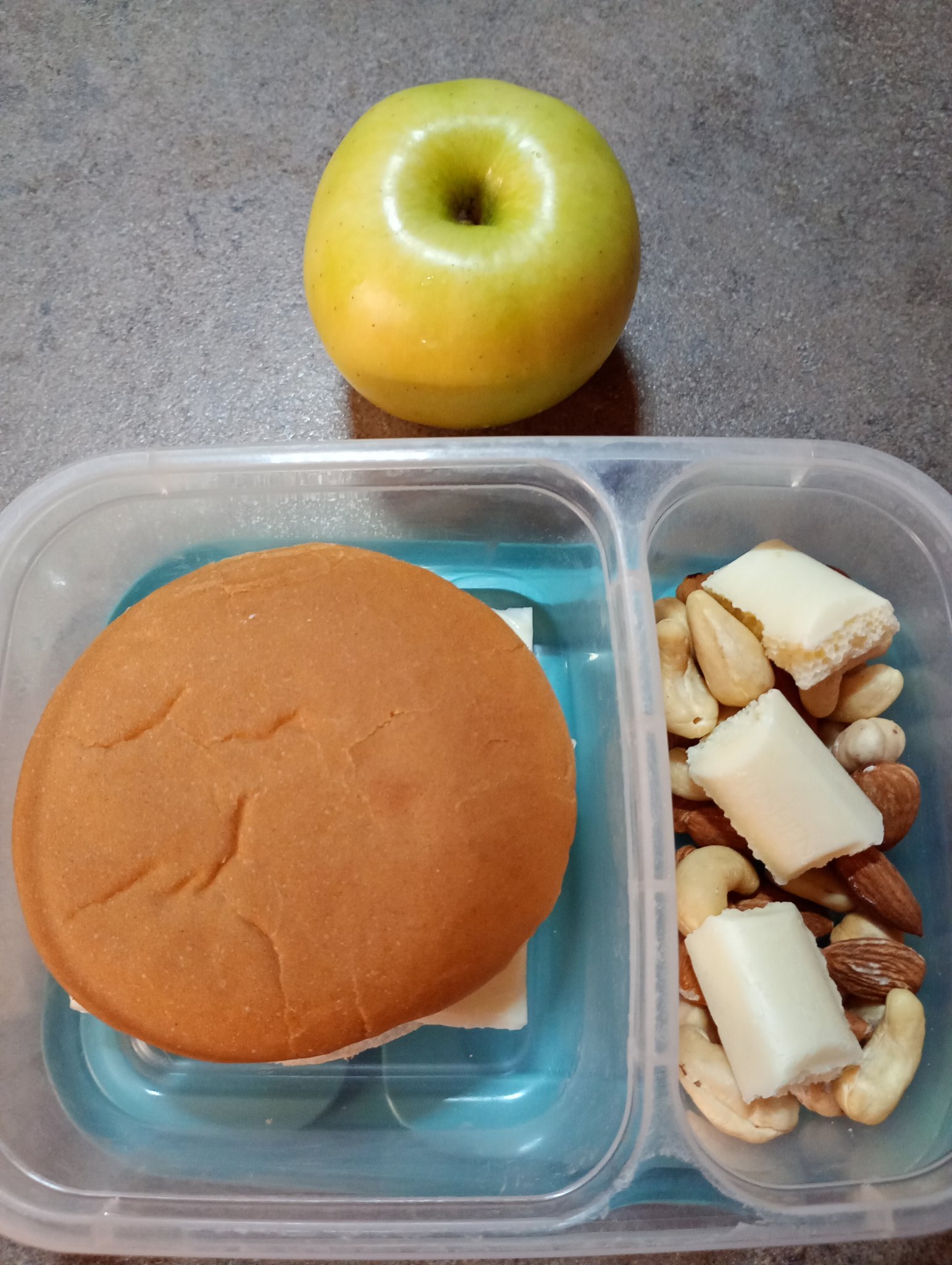 За днес хлебче с крема сирене, шунка, кашкавал и кетчуп, ябълка, кашу, бадеми , лешници и парченца бял шоколад.