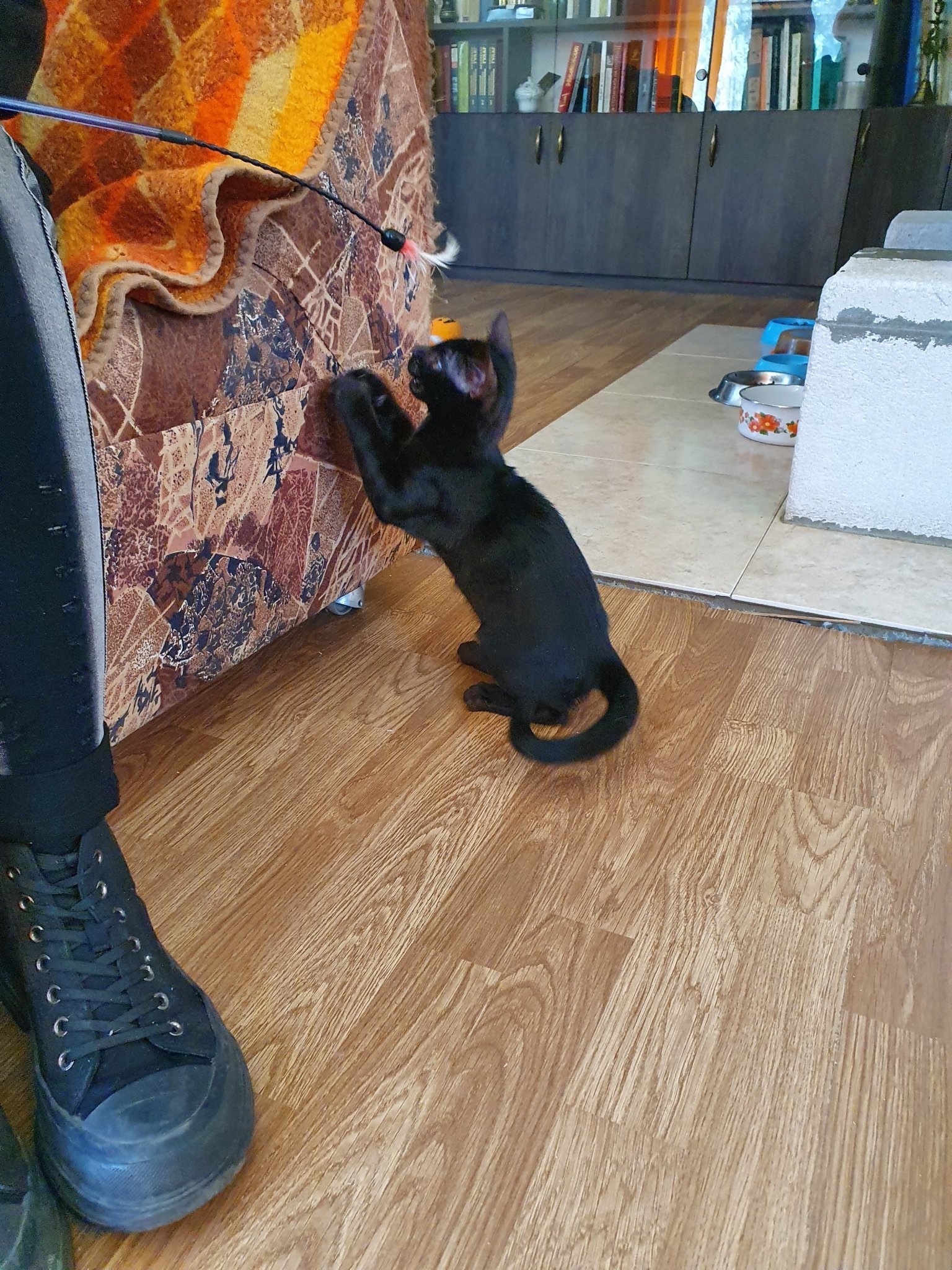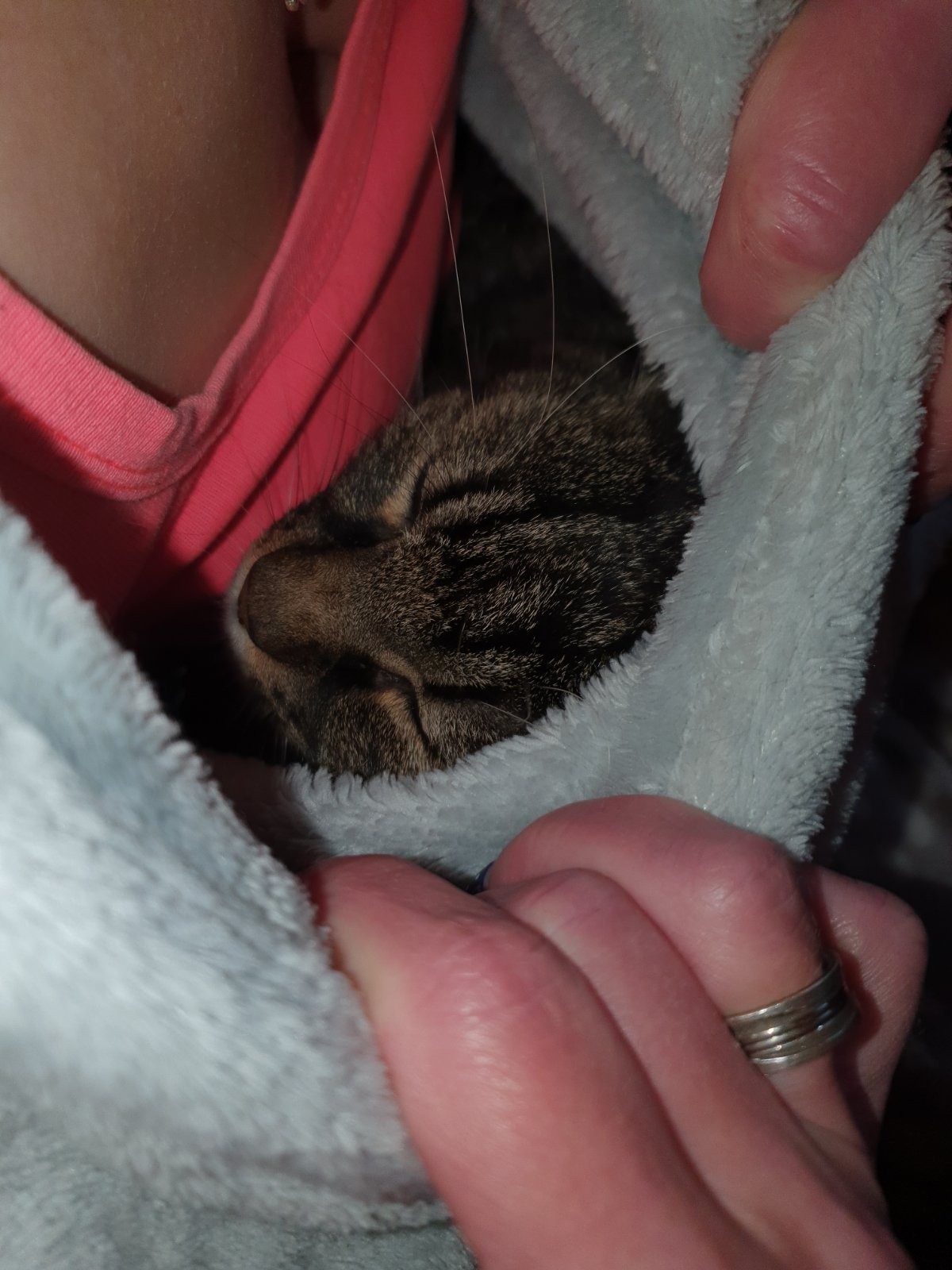Малкото е мега сладко и гушливо. И като се прибера от двора, идва и ми се радва. Ако спи и отида да го галя, не ме гледа с пренебрежение или досада като Точка, става мъркайки и идва да се гали и гушка. Как да не го обича човек? Още не мога да разбера, що за човек може да го е захвърлил на пътя между град и села, пълен пущинак и бесни коли. Не мога, дори да беше някакъв див звяр, пък то добричко, гушливо и любвеобилно...