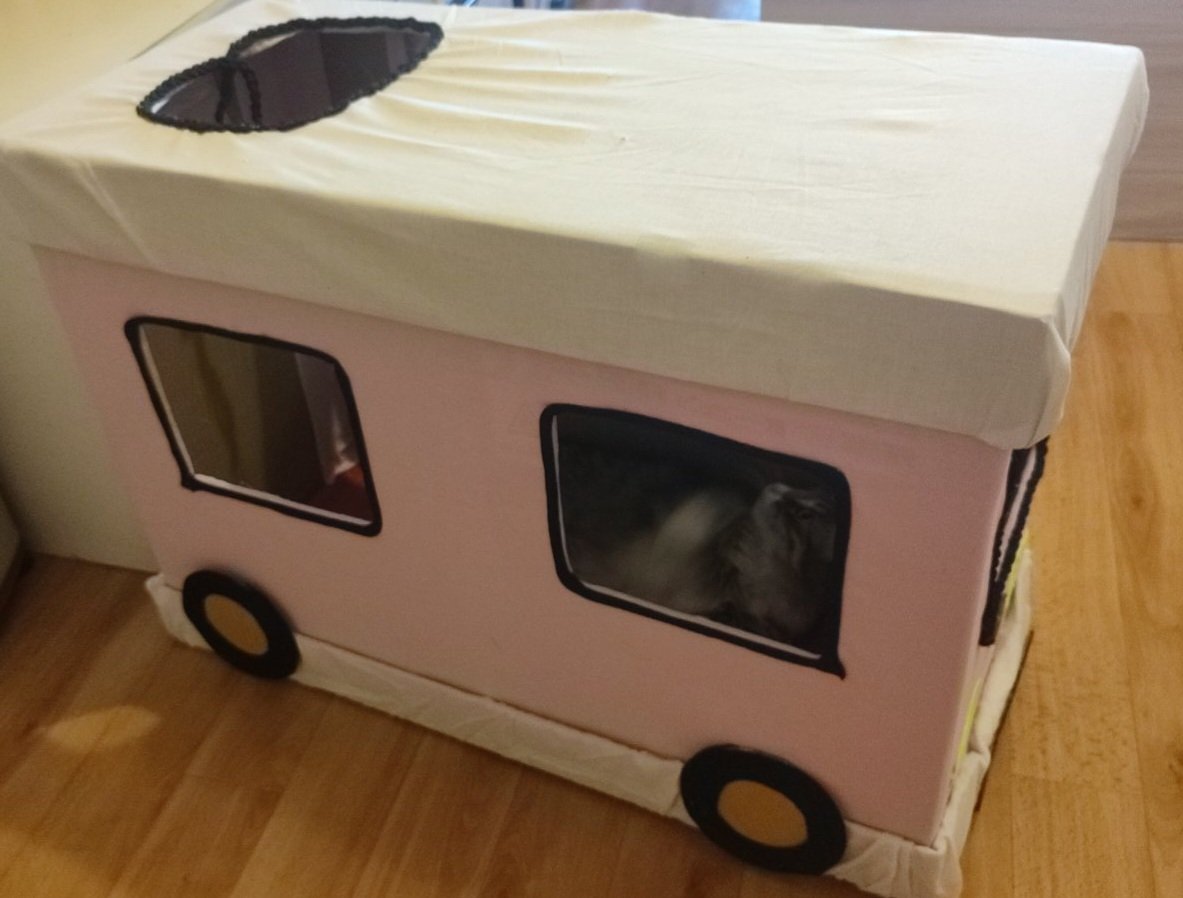 Поми, как да няма кашон, цял Линошмобил сътворихме с кака ѝ, качвала съм снимки не веднъж, определено не ѝ омръзва, играе си, дращи си на него, а и спи там през деня. Отвън е облечен със стари чаршафи, но от вътре си е кашон.