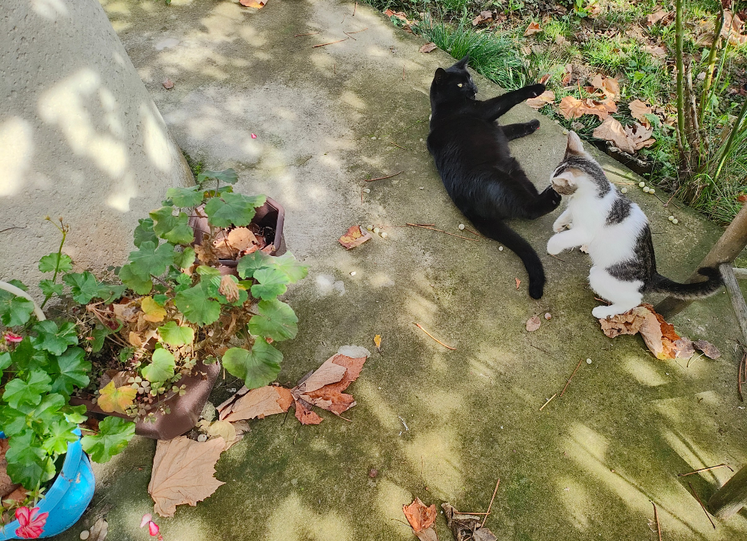 От вчера пускаме Лео в предния двор. Да подскача и лови мухи, че има неизчерпаем източник на енергия. И кой го пази? Чери 🥰