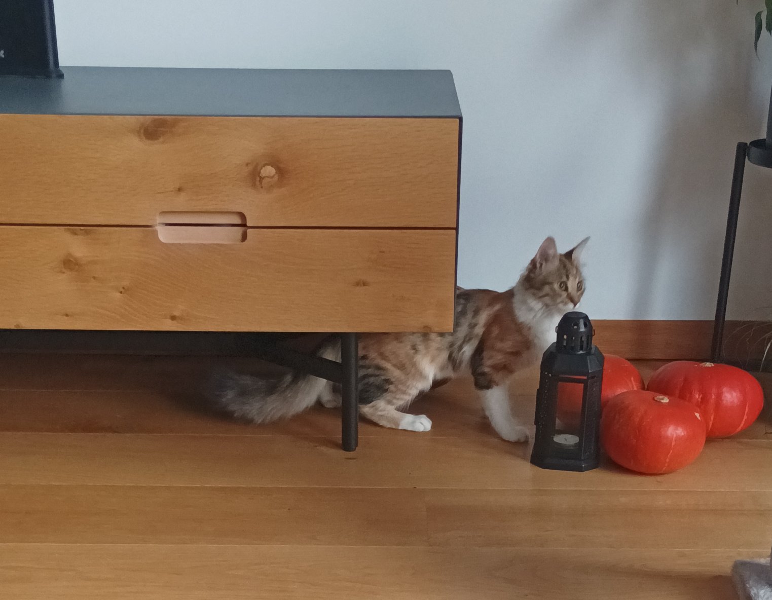 На мен точно на разгонена ми прилича котката от клипчето.Като дете имах котка,женска,точно по този начин мяукаше като беше разгонена.То е специфично според мен това мяукане и се разпознава.Също когато търсят децата си мяукат по подобен начин-общо взето при търсене на друга котка е това мяукане.От мен една Мая при тиквите.Играе с тях,но не мога да я хвана за снимка как ги награбва.
