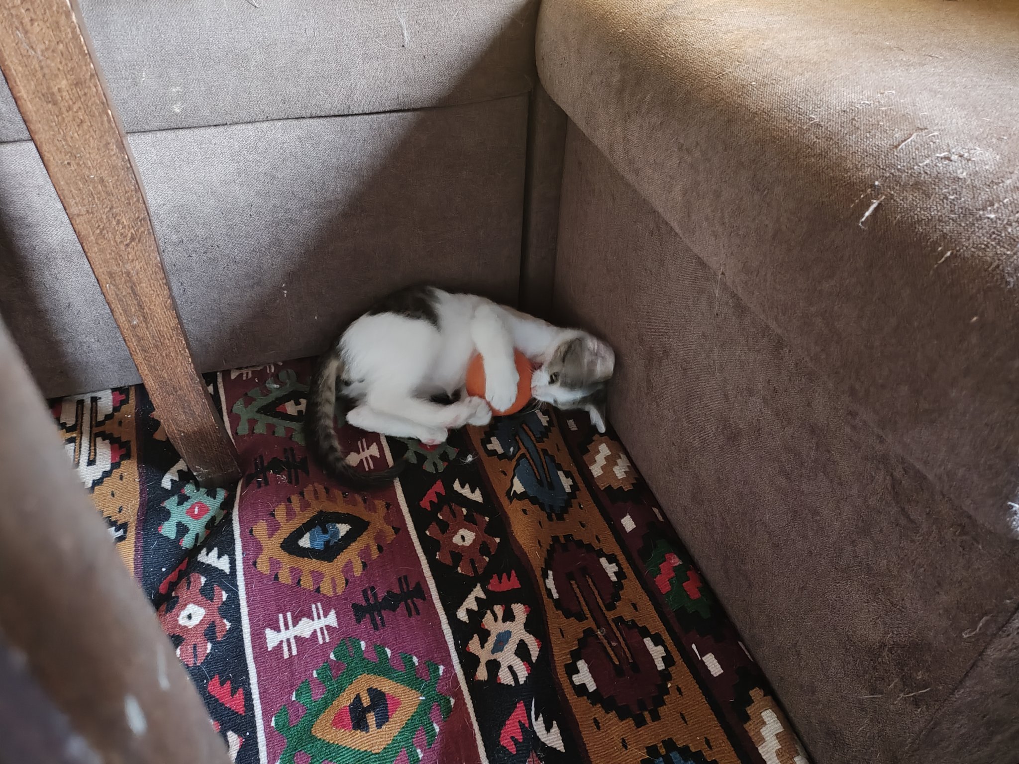 Лошото е че започва да я гони и бие. Кастрирани са и двамата. Не че и тя не му плясва по някоя лапа докато той си лежи а тя минава. Често битката за територия протича по следния начин - тя си намира нещо ново и го души. Или просто си лежи.