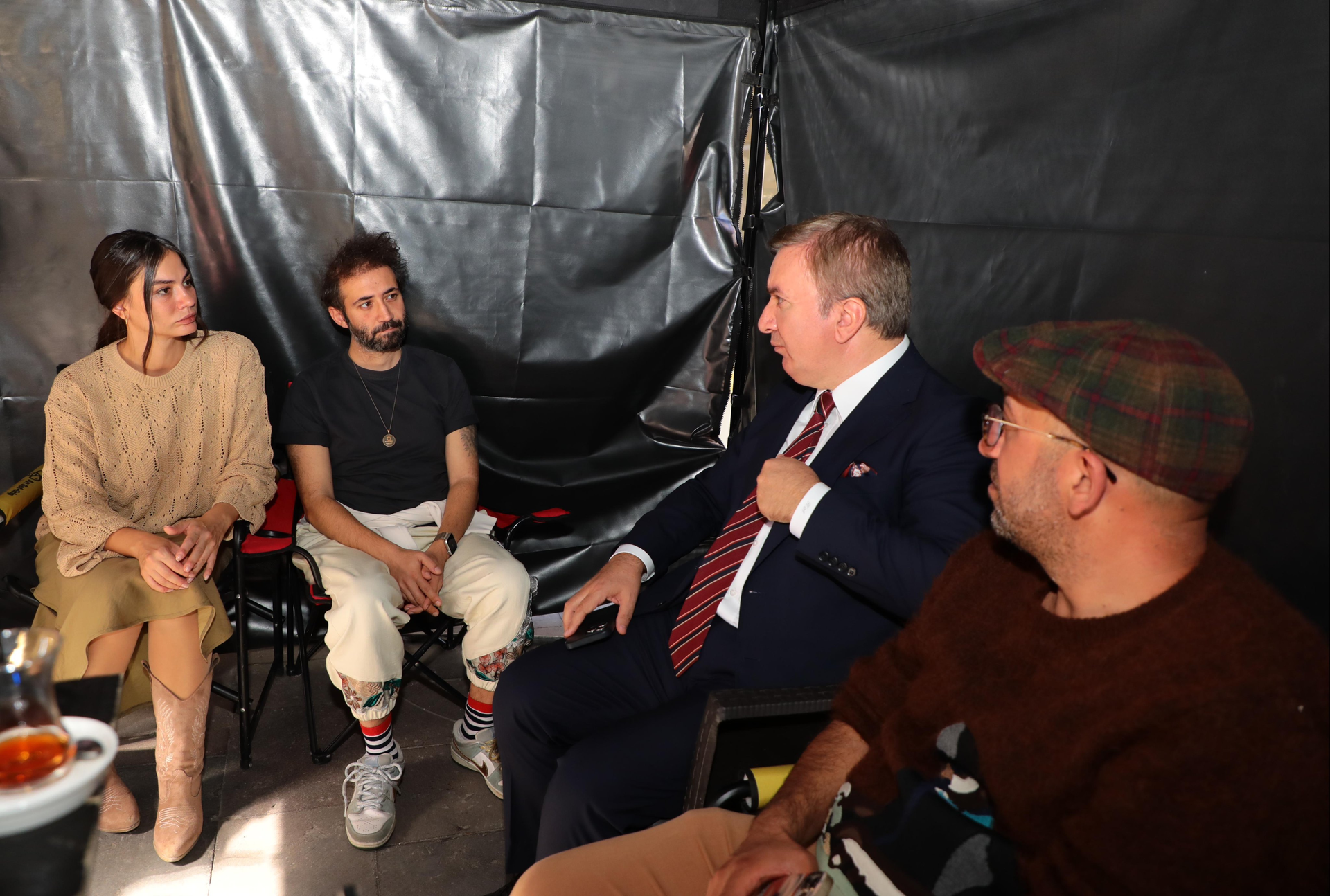 Валията на Ерзинджан днес е посетил снимачната площадка на "Джиновите сватби" и е разговарял с режисьора Ферит Карахан, Демет и Сарп Бозкурт. Заявявайки, че всяко кътче на града е отделен естествен декор и че заснемането на филми е много важно за популяризирането на Ерзинджан, валията е изразил задоволството си от приемането на снимачния екип на тяхна територия и е пожелал успех на целия екип.