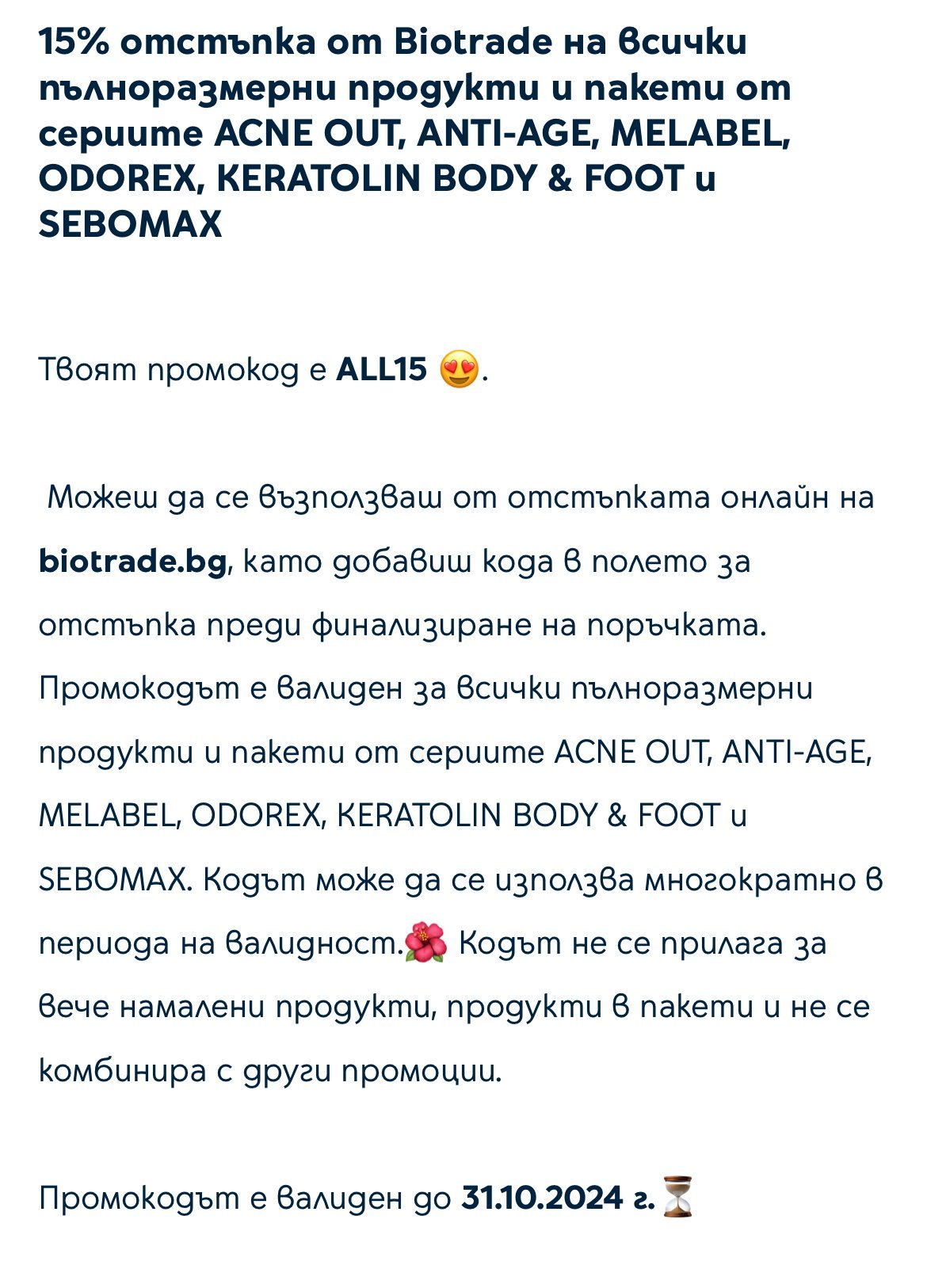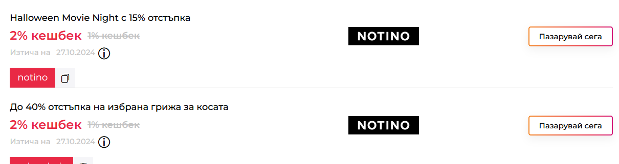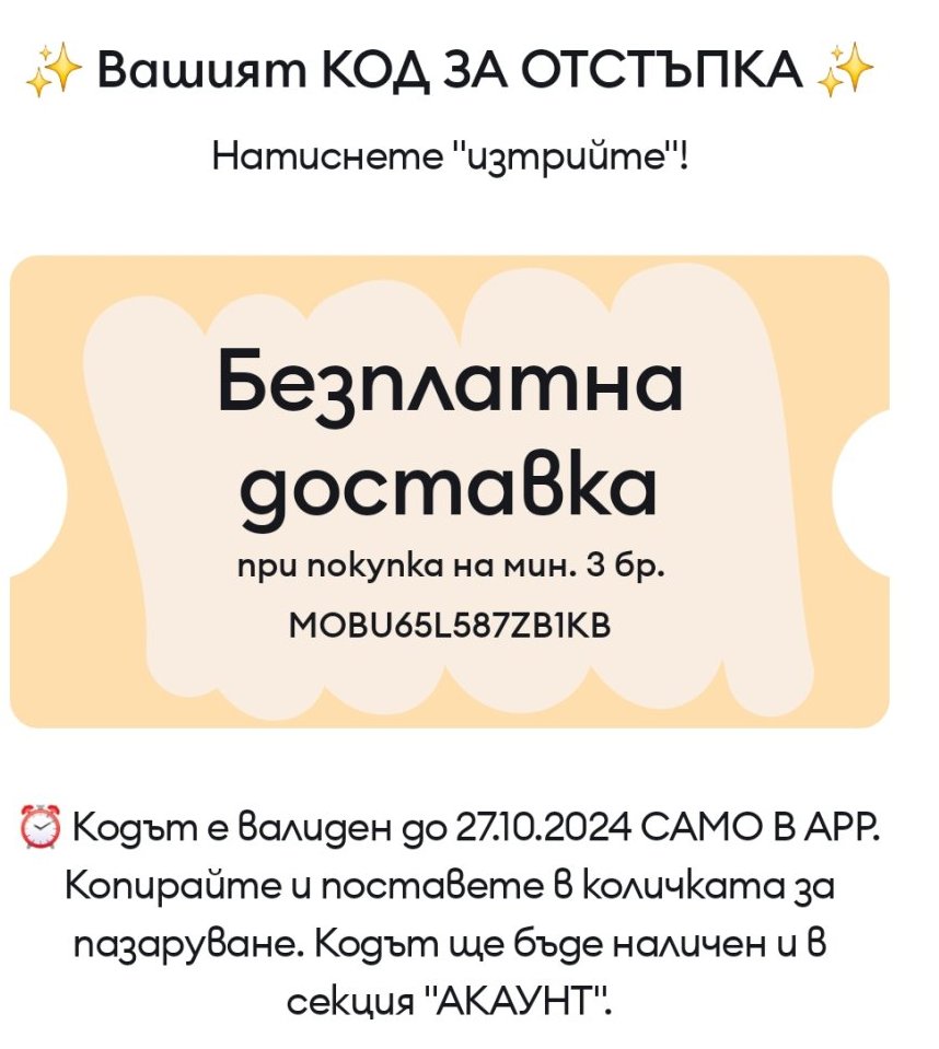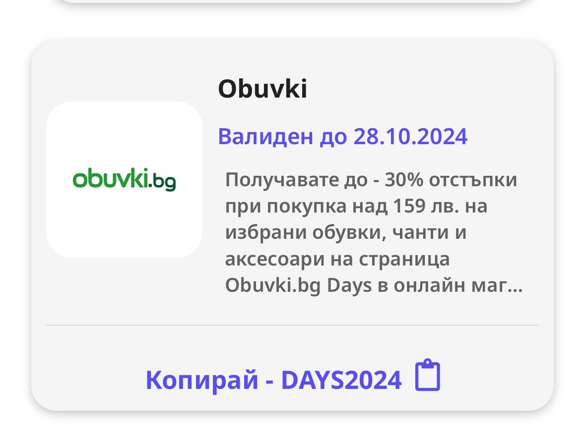 В момента има два налични промоционални кода. Първият е 10% отстъпка с код 2083-0051-1973-8767. Друг валиден код е IRINA20, който предлага 20% отстъпка при поръчки над 120 лв. и минимум два продукта, като се прилага до 13 октомври 2024 г. Код за отстъпка, който осигурява 20% намаление на сайта на Fashion Days, е подкрепен с минимална поръчка от 149 лв. Кодът е YOANA20.