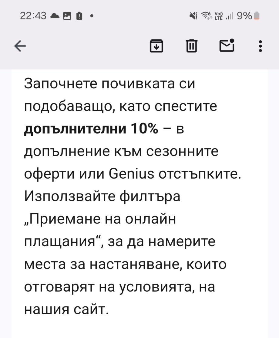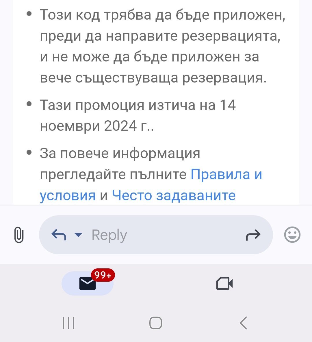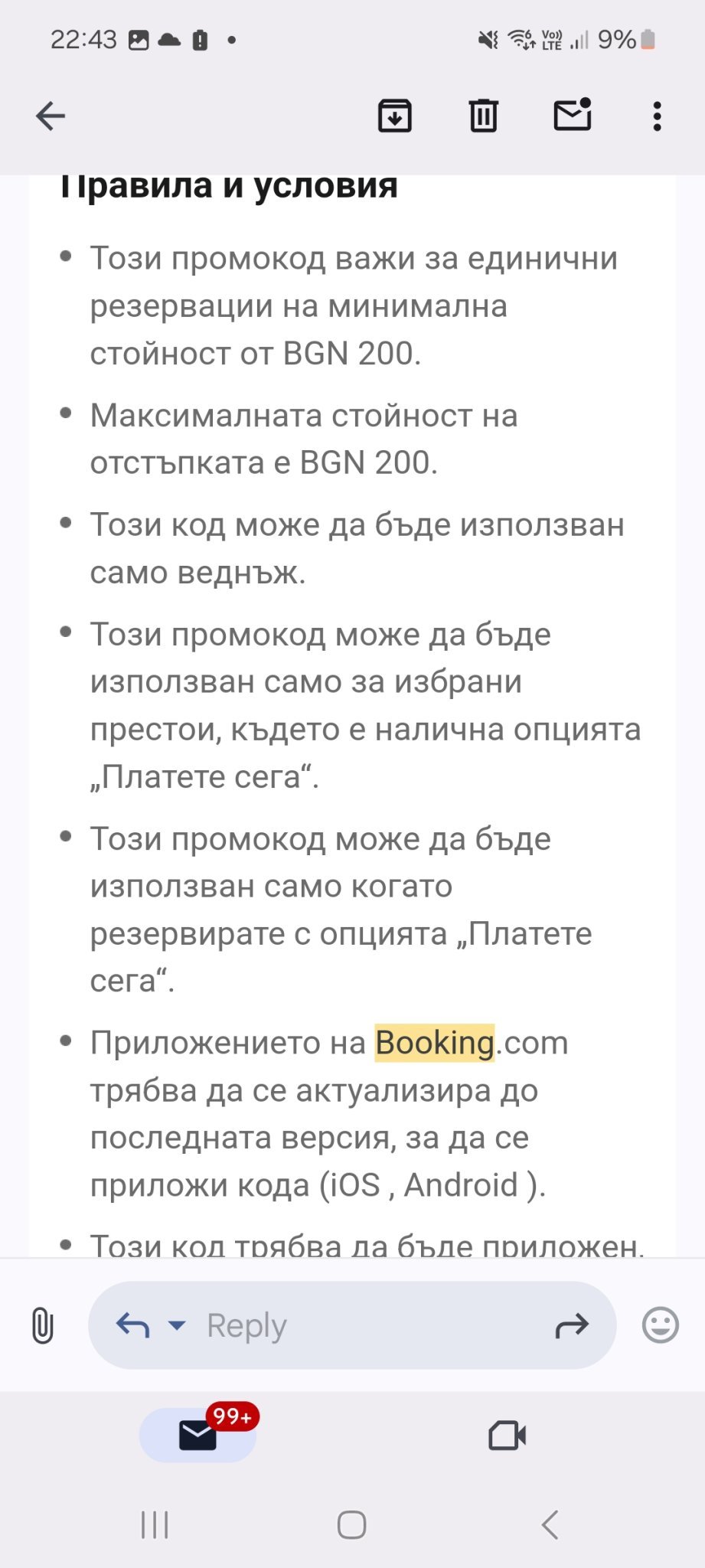Имам код за букинг, за резервации на минимална стойност от 200 лв. Може да бъде използван само за избрани престои, където е налична опцията „Платете сега" и може да бъде използван само когато се резервира с опцията „Платете сега“. Валиден е до 14.11.2024 г. Който го иска,нека ми пише на лично.