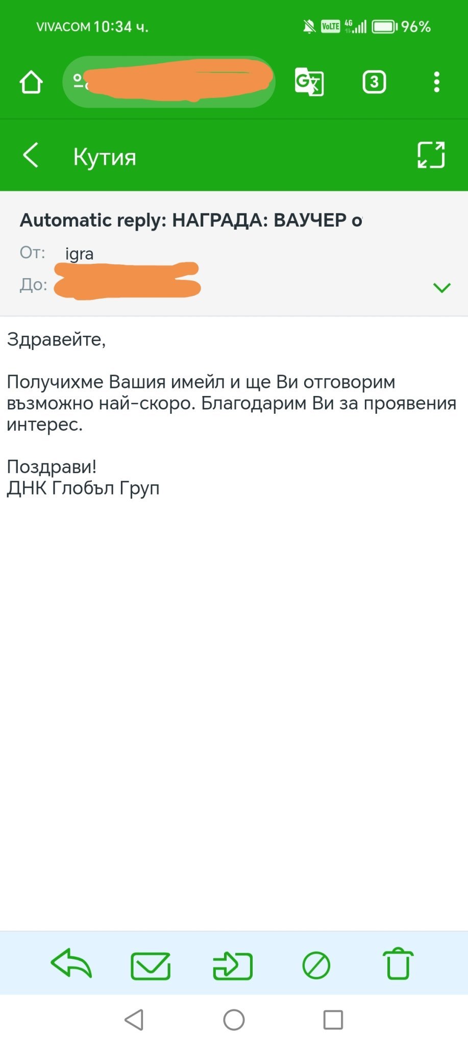 Тези които са спечелили от P&G /и аз съм със ваучер за Кауфланд 100лв/- това ли получихте, като автоматично съобщение, след попълнена и изпратена декларация?🤔 Благодаря.