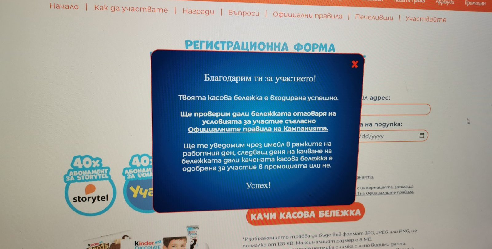 Имам питане за играта на Киндер, тъй като се включих късно вчера. Освен имейла за направена регистрация, да очаквам ли втори за одобрена бележка?