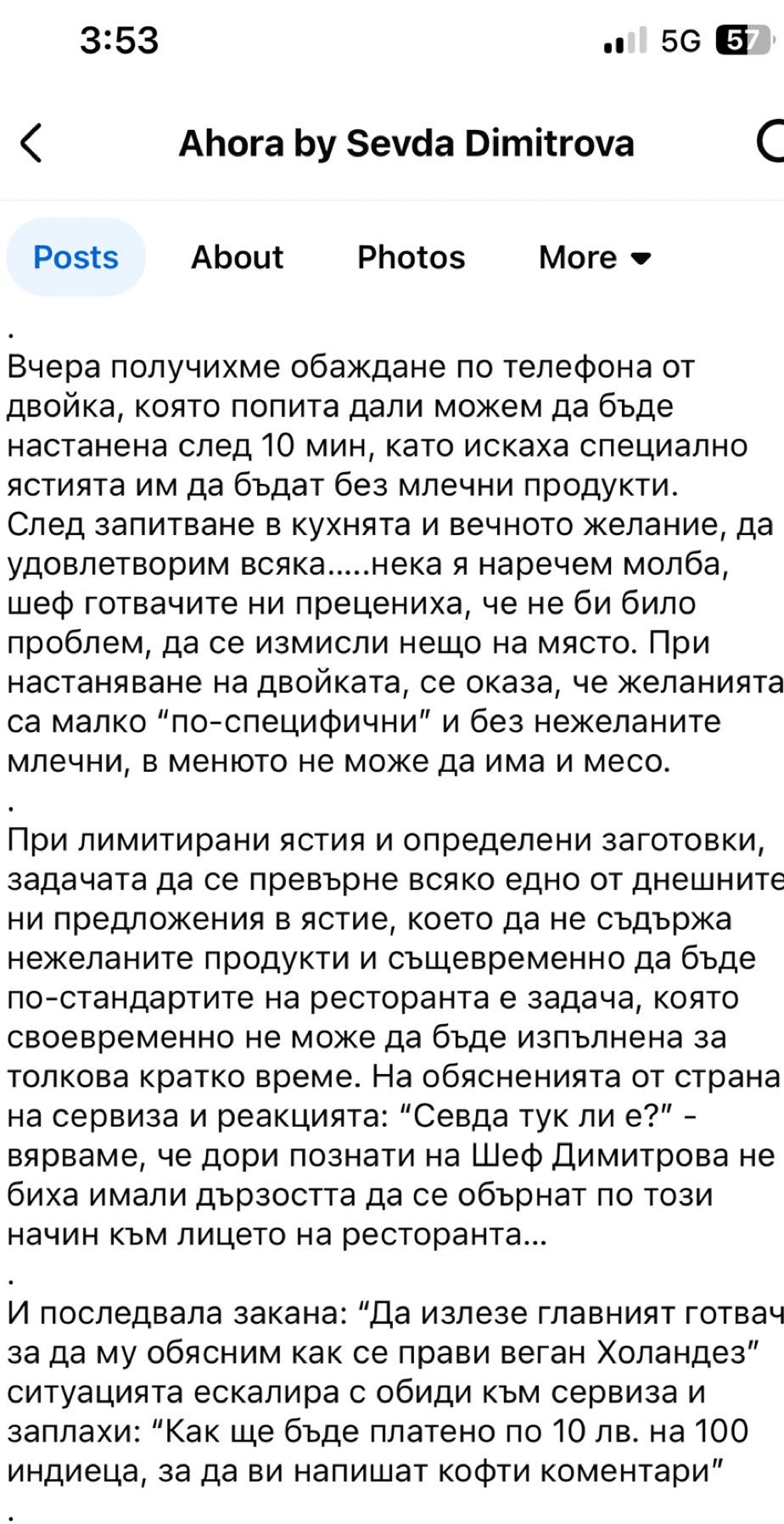 Ето още един компромат от самозабравили се. Севда Димитрова от Masterchef, както много от вас знаят, си има ресторант - AHORA. Аз съм клиент на Севда и впечатленията ми от нея са отлични. Преди дни тя публикува това - неприятна случка с капризни клиенти. Публикуваха и имената им - Volen Vulkov и Desi Radoslavova. Волен Вълков е предприемач, участва в някакво дружество за софтуер как се прави CV (как си пиша CV-то досега без тоя софтуер - не знам!). Та като четох претенциите на този Волен, лесно е човек да помисли, че е център на Вселената, нищо, че никой не е чувал за него.