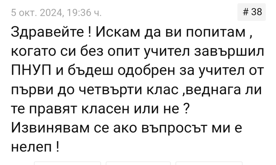 По въпроса с класното ръководство. Въпросът беше, дали ако си завършил ПНУП, ще станеш веднага класен. Та отговорих, че това не е възможно, поне в училищата в големите градове. Разбира се винаги има изключения от правилото. Това всички го знаем. След мен няколко колега отговориха, че веднага са станали класни. Да, ама на 7- ми и не знам си кой клас. В начален етап не е така. Не съм чувала за голямо училище дето ще вземат за класен някой ей сега завършил.