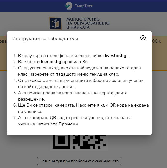 Lunna_sonata, няма нищо притеснително. Зареждаш сайта квестор.бг . Трябва да влезеш с твоя еду.мон профил. От там избираш класа, който наблюдаваш. Избираш име на ученик и сканираш кода, който той вижда на екрана. В момента, в който го сканираш, на ученика ще му се зареди теста. Минаваш на следващия ученик.