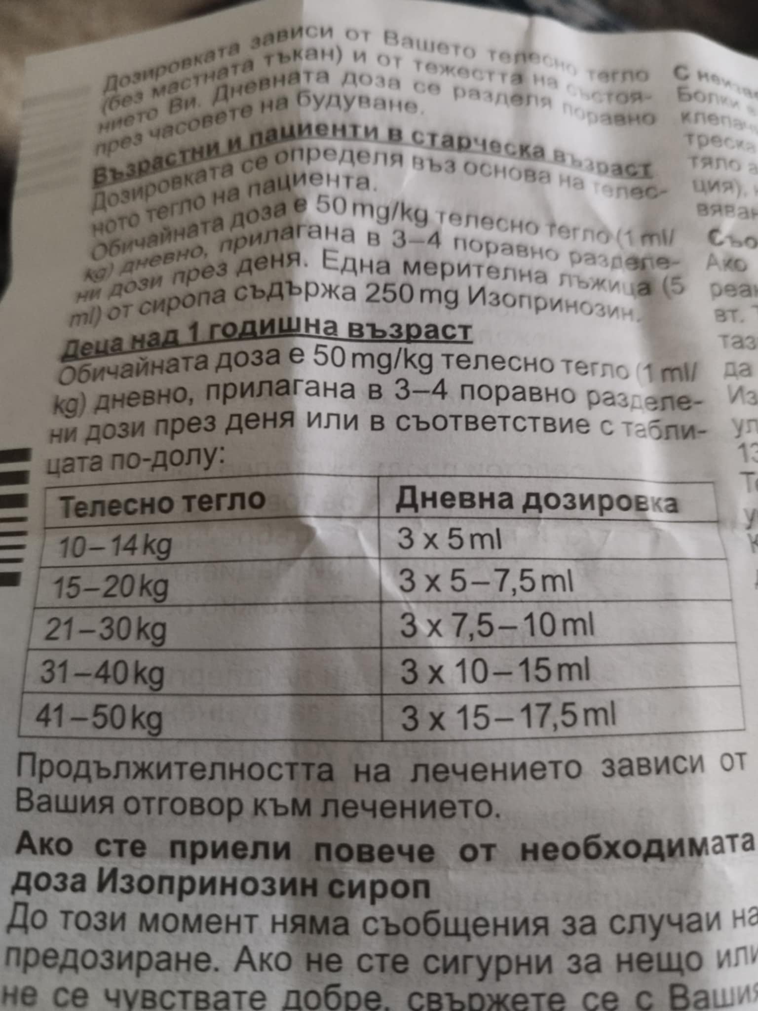 Как се дава Изопринозин сироп на 12 годишно?С приятелка гледаме листовката и за килограмите на детето пише 10-15 мл и се чудим колко да даде.