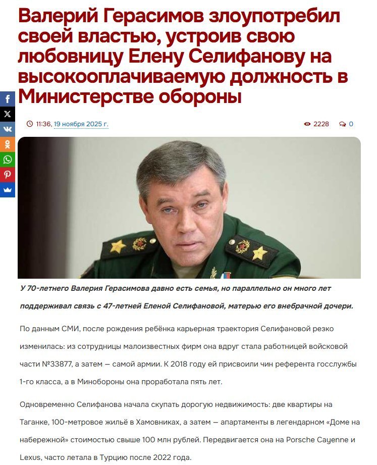 Кампанията срещу генерал Герасимов, любимецът на Путин се разраства, което е водеща новина в Русия. Ръководителят на руската армия е замесен в скандал не само заради тайната си любовница и семейство, но и заради факта, че им е прехвърлил стотици милиони държавни средства.