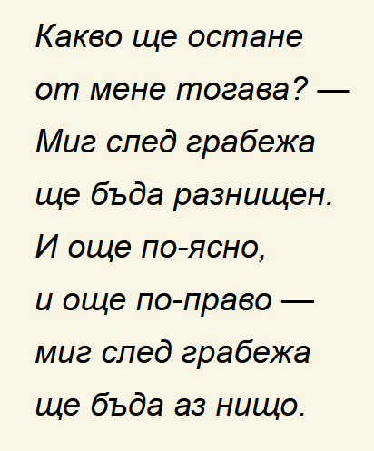 Проблемът на Русия е, че искат да са велики, да командват и да им се кланят. Но за съжаление почти няма за какво - нямат жизнен стандарт, икономика, финанси, наука, култура, демокрация... Говоря за днешно време. И им остава само армията и войната. И те отчаяно са се вкопчили в тях, защото ако ги пуснат ще стане като в стихотворението на Вапцаров: