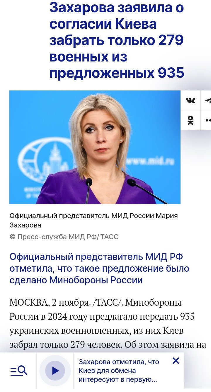 Според руzките власти руzия била предложила да върне на Украйна 935 украински военнопленници, но Украйна си прибрала 279. Вярвайте на Захарова!