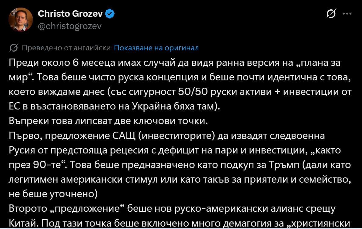 ·Разследващият журналист Христо Грозев казва, че преди 6 месеца е видял почти същия "мирен план", който е бил изцяло руска концепция. Той е съдържал 30 точки, а двете, които сега не са обявени публично са: