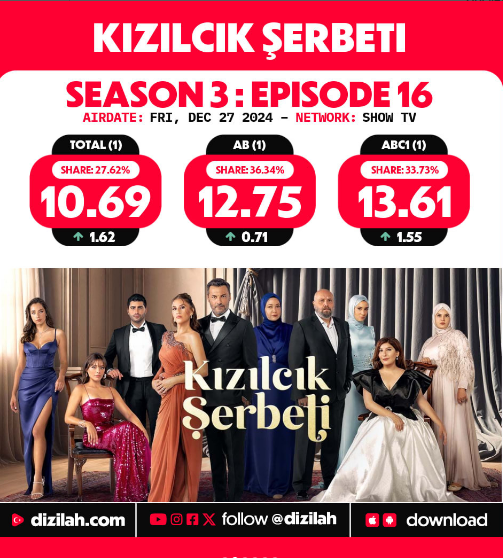 Феноменалната поредица на Show TV Kızılcık Şerbeti доказа успеха си за пореден път, като затвори последния епизод за 2024 г. с рекордни рейтинги. 16-ият епизод от сезон 3 достигна впечатляващи нива от 13,61 на ABC1, 12,75 в AB и 10,69 на All People. Към нарастващия успех на поредицата беше добавено ново име: Ece İrtem!