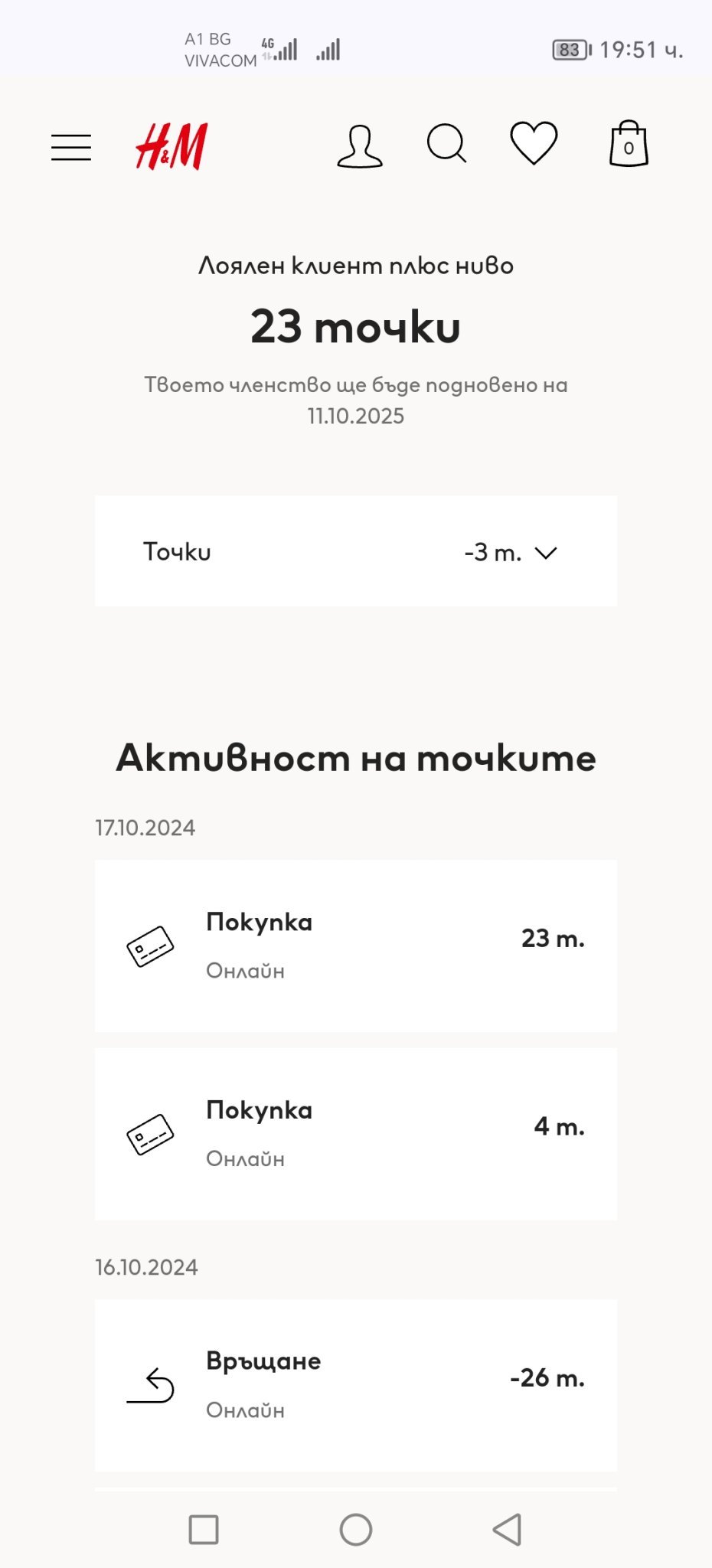 Имах 408 точки (само 8 над границата за плюс ниво), които нулираха на 12 октомври. Имах връщане на 2 пратки за 26+4 лв., които нарочно забавих, за да не падне нивото. В крайна сметка извадиха 30 точки от 0 точки, но запазиха плюс нивото. Последваха 2 нови поръчки за общо 27 лева и в момента на едното място пише, че имам - 3 точки, а на другото 23. 😃 Не знам кои точки ще гледат в бъдеще при изпращане на ваучер от 5 лв. или пресмятане на плюс ниво. 😃
