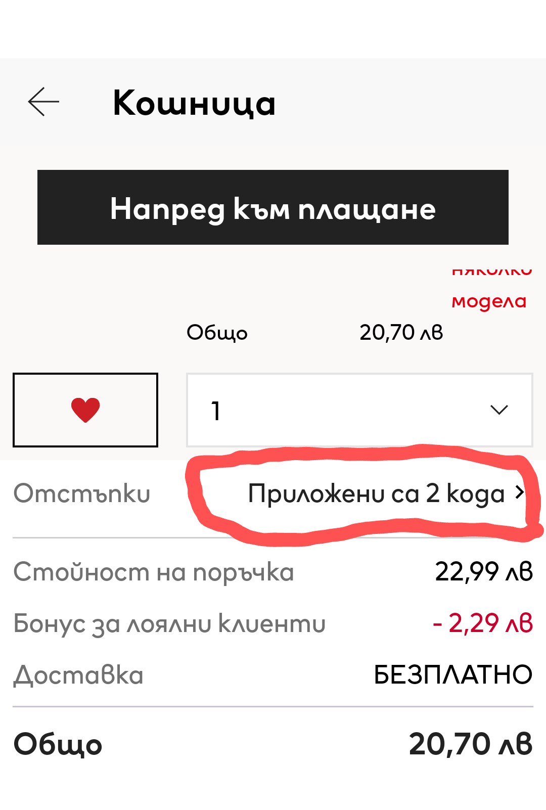 Прилагам 2 броя отстъпки по 10 процента, взима ги и двете отстъпки, а намалява само с 10 процента. Разочарована съм. Не съм го очаквала това от H&M.