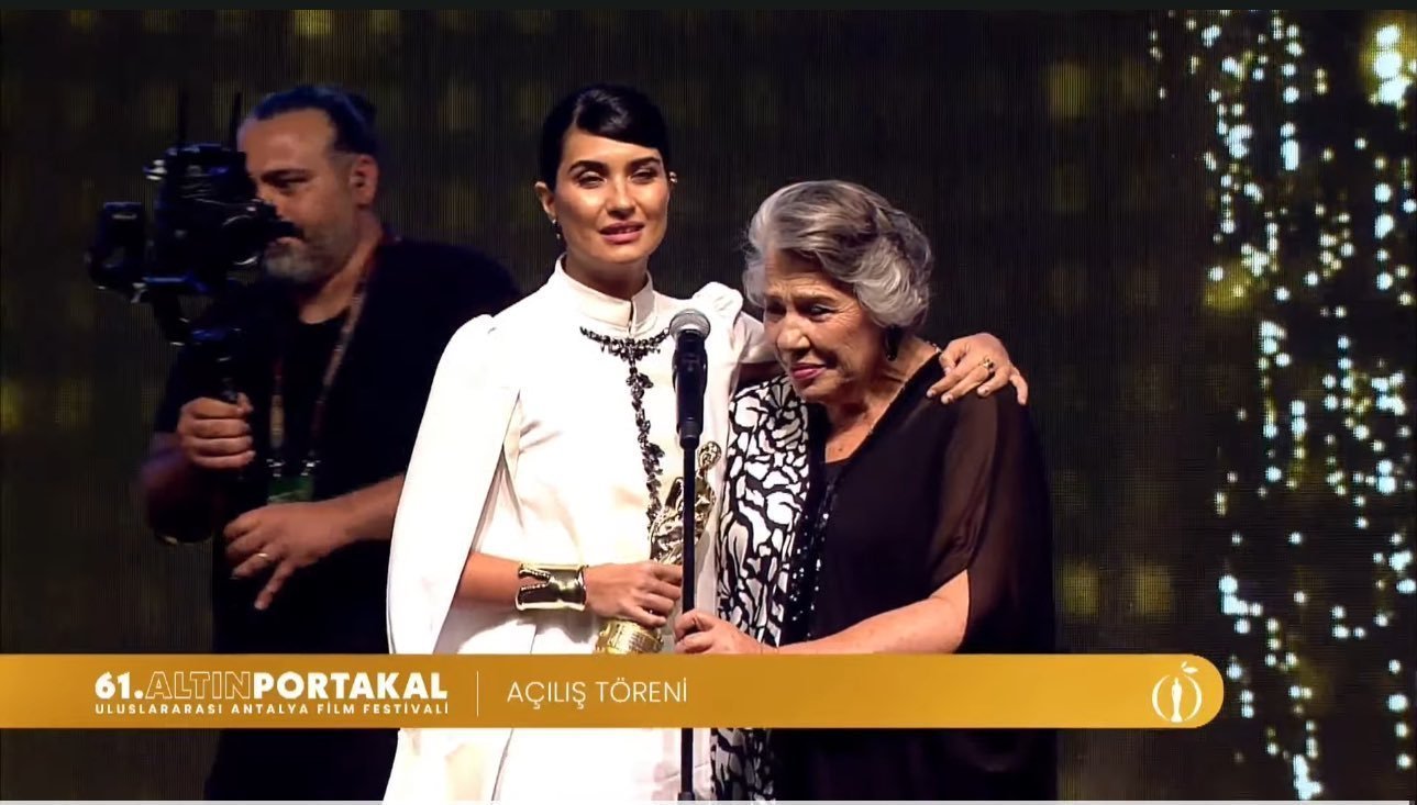 Aз пък да допълня и със снимката на Туба от същия фестивал в Анталия тази година, където тя връчва наградата за цялостно творчество на Ишил Юджесой (лелята на Елиф от "Мръсни пари и любов"):