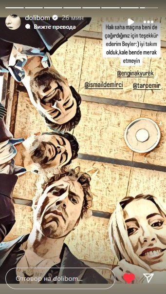 Днес са приключили снимките с Долунай Сойсерт и тя написа: Благодаря ви, че ме поканихте на футболния мач на закрито момчета, ние сме добър отбор, целта е моя, не се притеснявайте.