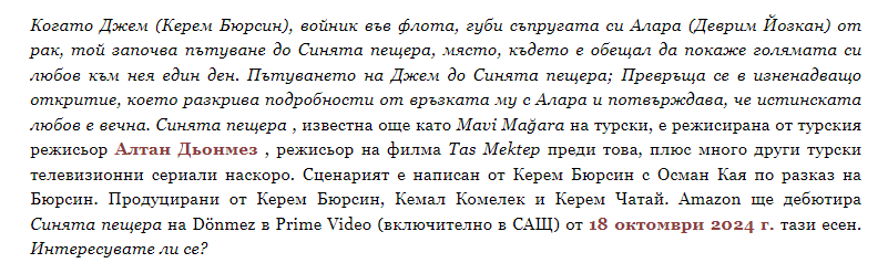 Направете вълшебно пътешествие през трогателната и завладяваща история на Синята пещера. Режисиран от талантливия Алтан Дьонмез и по сценарий на Керем Бюрсин и Осман Кая, този филм отвежда зрителите на много лично пътешествие на любов, разбито сърце и дълбоко себеоткриване. Синята пещера е нещо повече от филм. Това е вълнуващо преживяване, което говори на всеки, който някога е познавал дълбините на любовта и върховете на тъгата. Докато се впускате в тази трогателна и изящна история, пригответе се да бъдете трогнати и трансформирани.