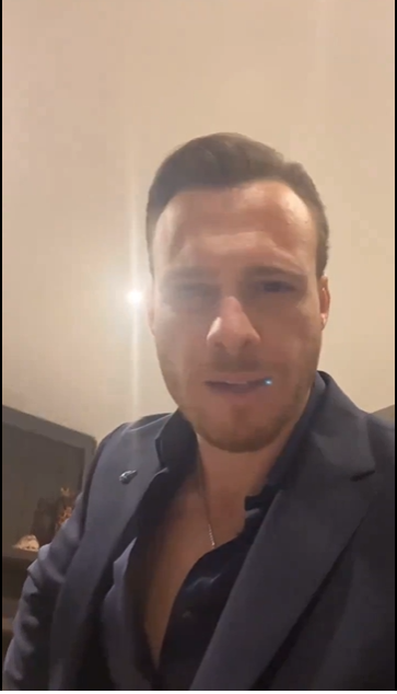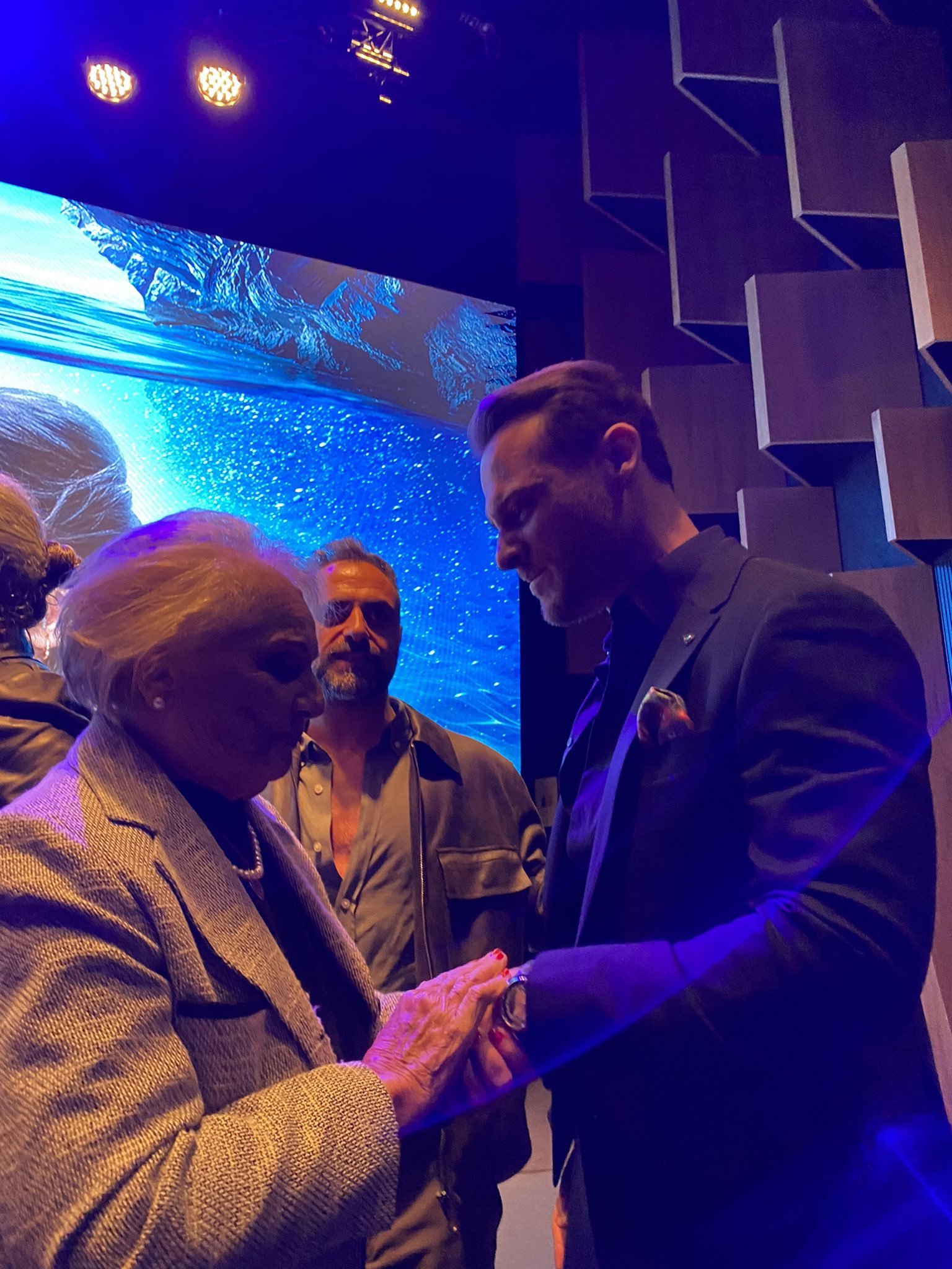 „Ех, какъв ден... И ето ни в края на деня. Току-що завършихме премиерата на Синята пещера, която мисля, че излезе. Искам да кажа, че излиза скоро. Така че, добре, утре ." Но утре е днес. Така че е объркващо, нали? Надявам се да се насладите на филма. Определено искам да ви благодаря, че повярвахте в този проект от самото начало. че винаги сте били до нас.. До моя партньор в BRAVEBORN. Много ви благодаря.. Винаги сте били там.. Трябва да благодаря на страхотния екип, с който работите Наистина много важен човек. И екипът... Невероятен постпродукционен екип. Много ви благодаря... и да лека нощ. Прекрасна нощ. Отивам да спя и до скоро Надявам се да ви хареса. Чао."